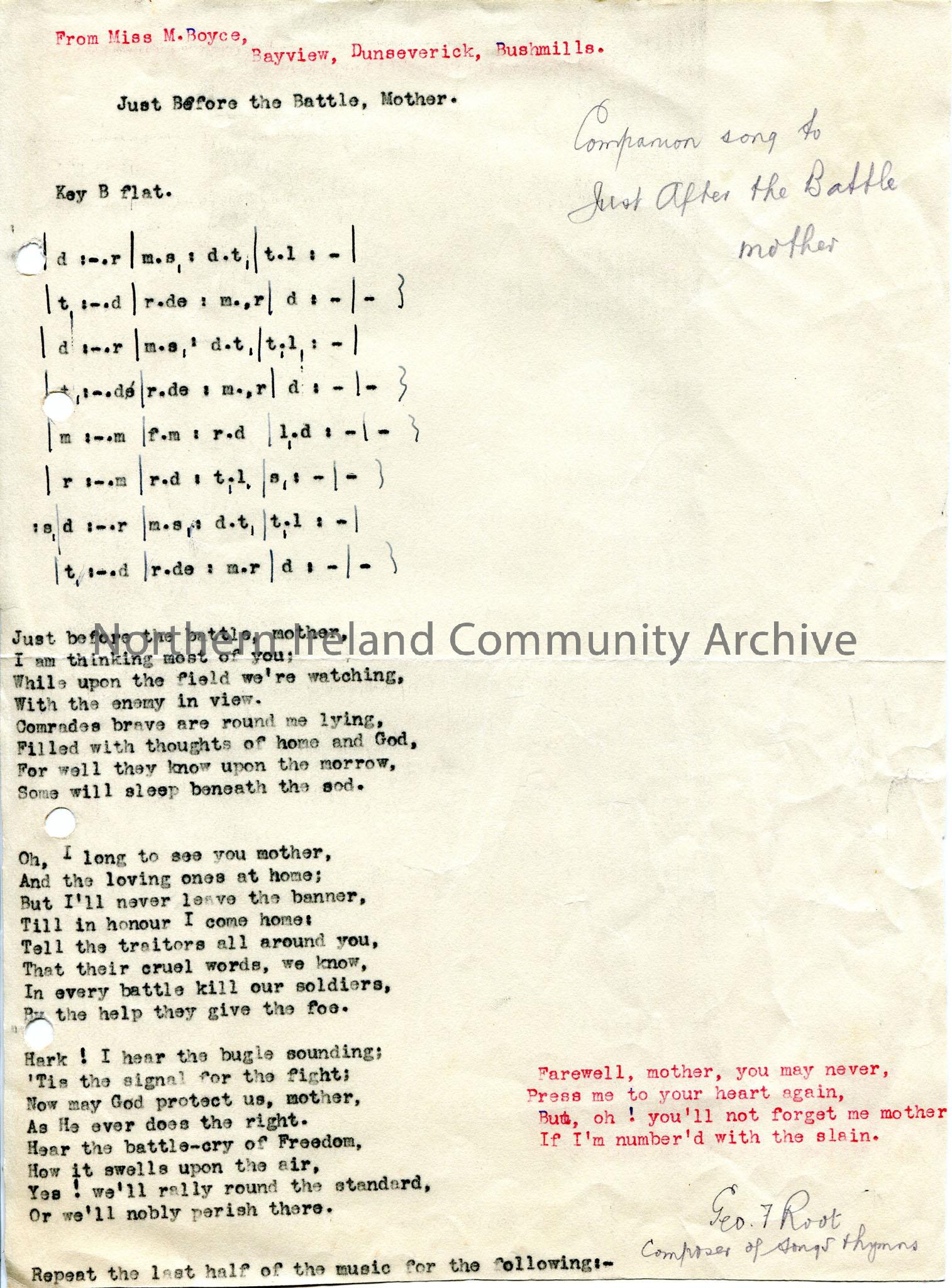 Typed tonic sol-fa notation and words to ‘Just Before the Battle, Mother.’