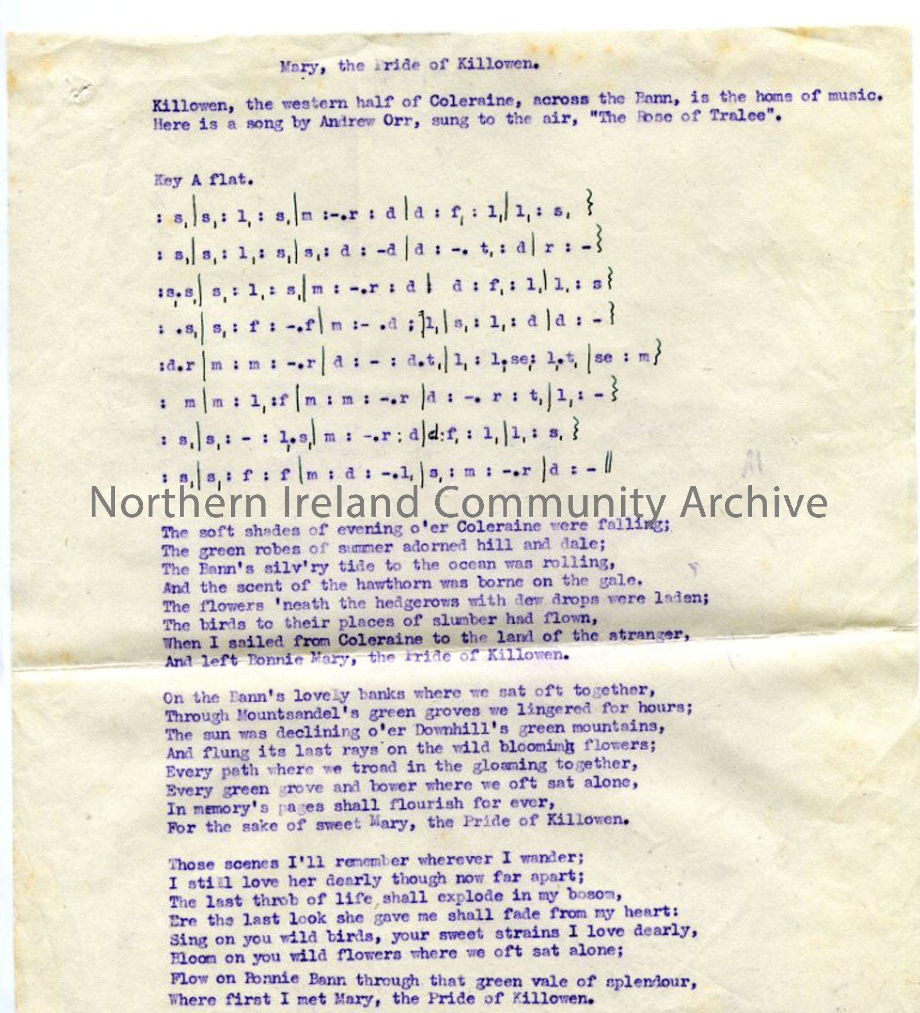 Typed tonic sol-fa notation and words to 'Mary, the Pride of Killowen'. Mentions Coleraine, the Bann, Killowen ('the home of music'), Mountsandel, Downhill. Sung to the air 'Rose of Tralee'.