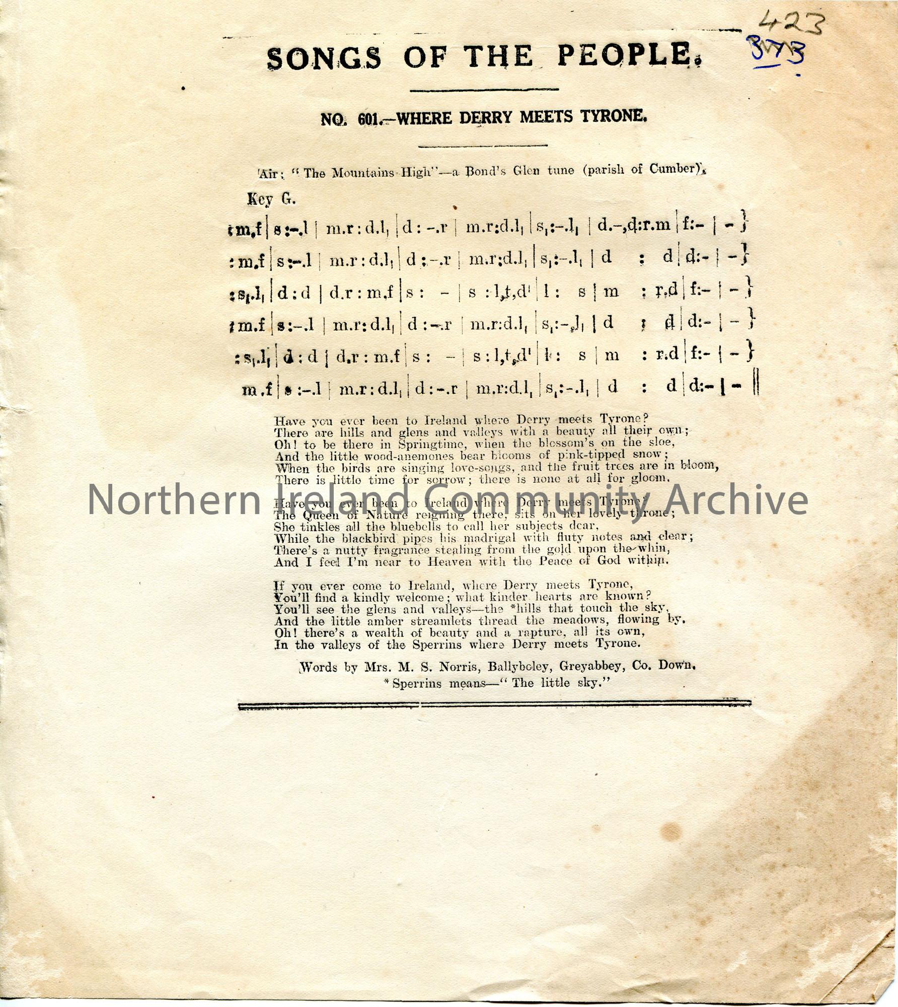 Typed tonic sol-fa notation and words to song for Songs of the People. Song titled, 'No. 601 - Where Derry Meets Tyrone'. Air titled, 'The Mountains High'. Words by Mrs M. S. Norris, Ballyboley.