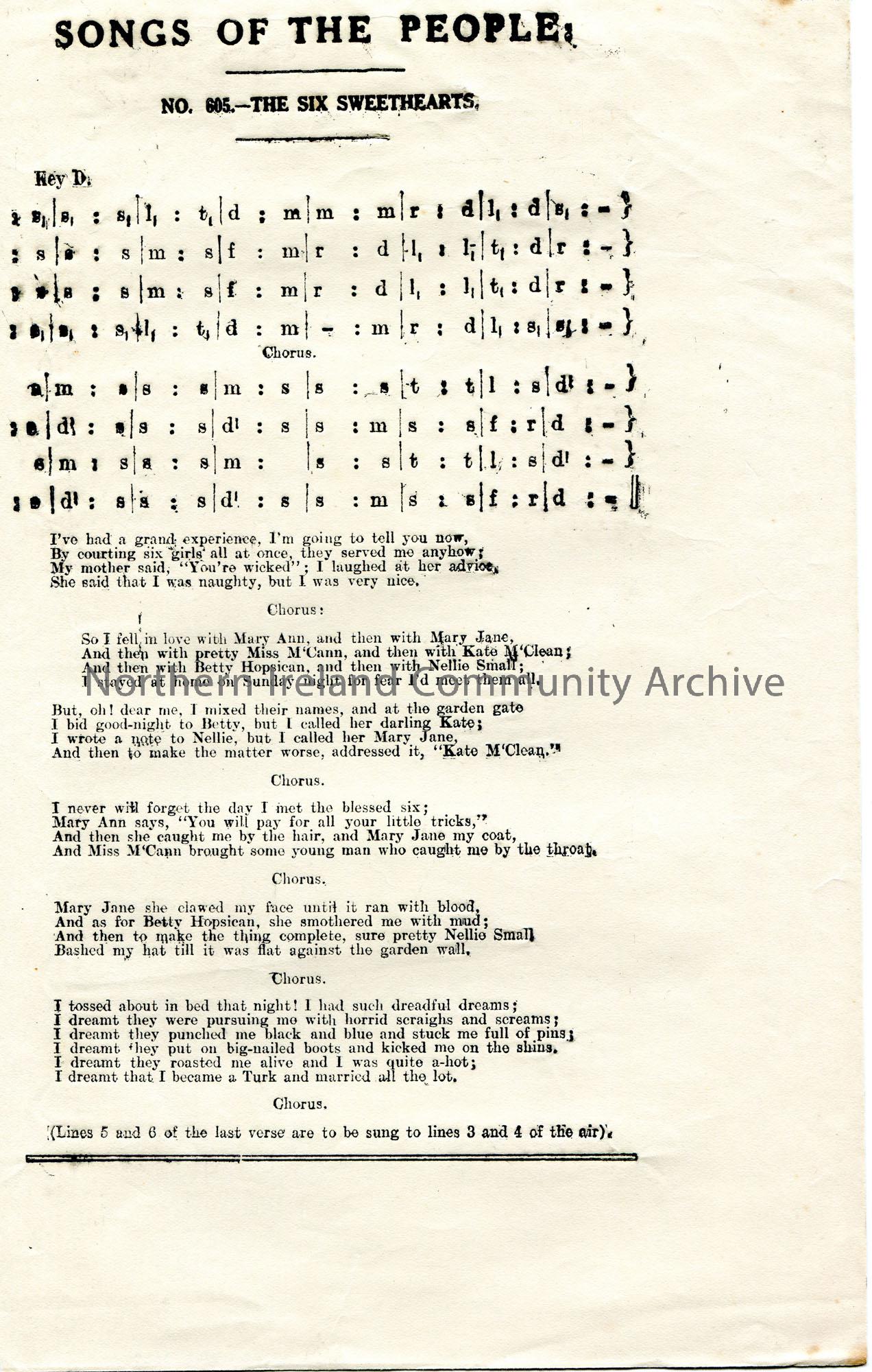 Typed tonic sol-fa notation and words to song for Songs of the People. Song titled, ‘No. 605 – The Six Sweethearts. Humorous song re a man who courted…