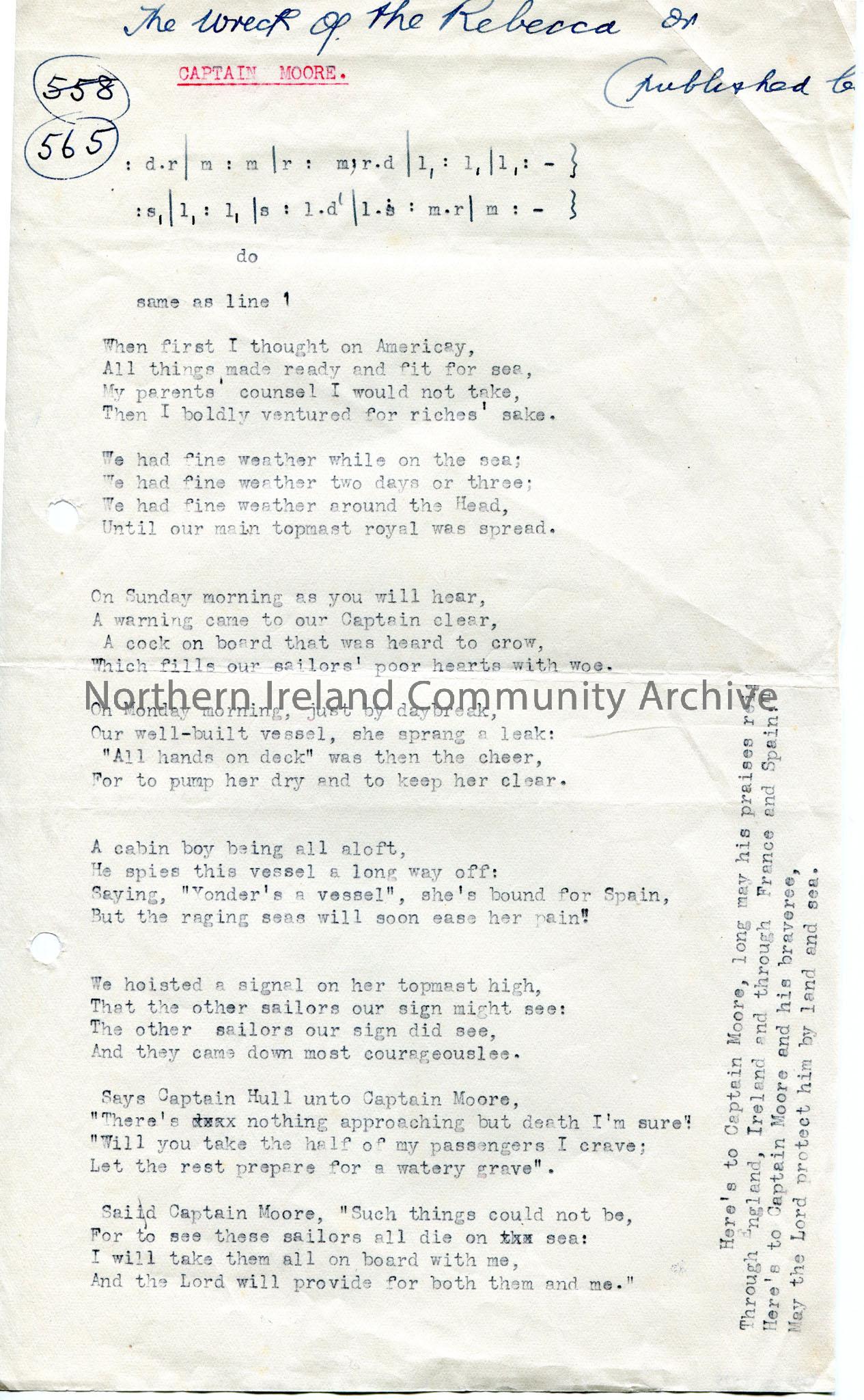 Typed tonic sol-fa notation and words to song (nine verses) titled, 'Captain Moore'. 'The wreck of the Rececca' handwritten at top of page. Song re a sinking ship. Last verse written vertically along right side of page.