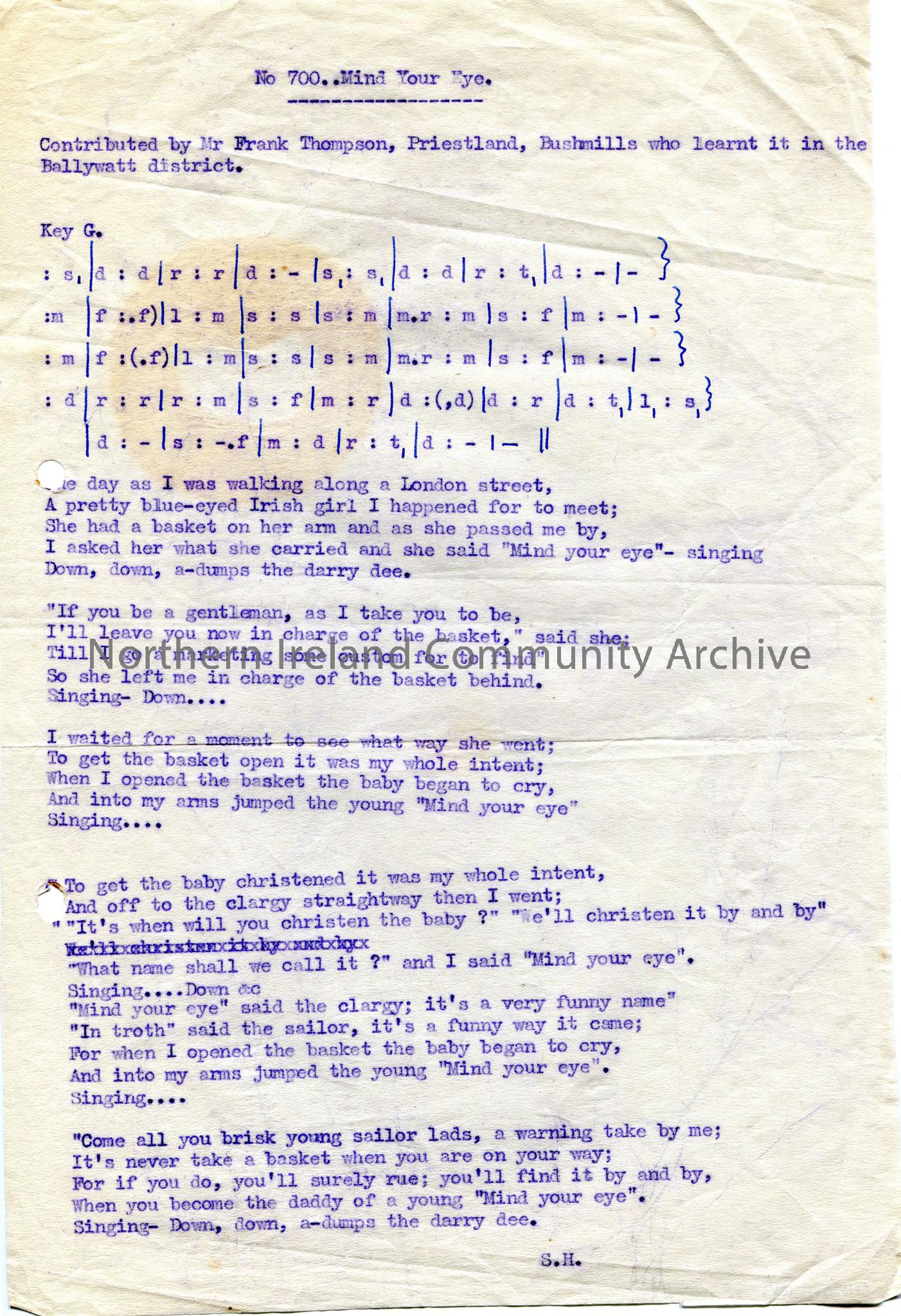 Typed tonic sol-fa notation and words to song, ‘No. 700 – Mind Your Eye’. By Mr Frank Thompson, Bushmills who learnt it in Ballywatt district.