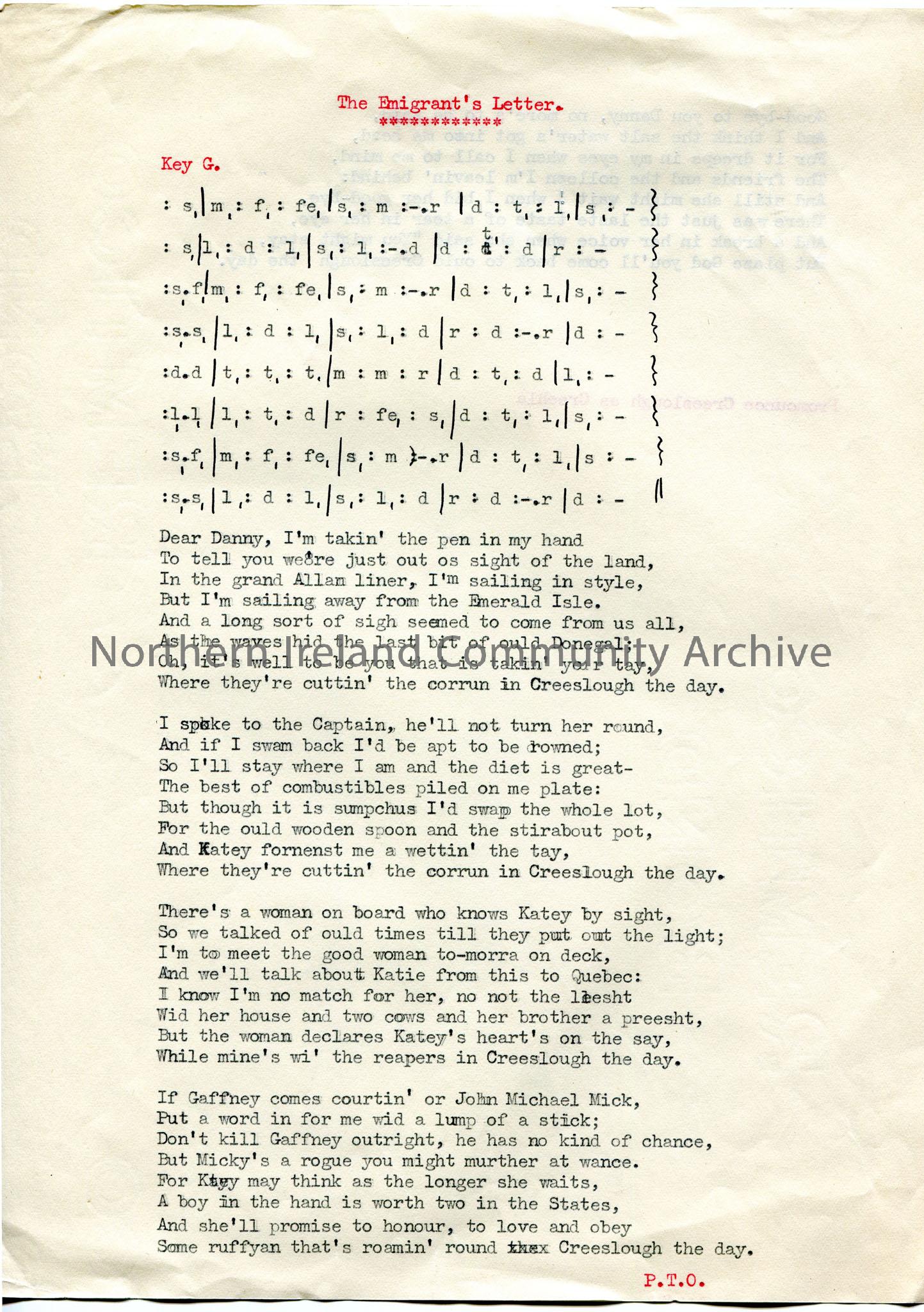 Typed tonic sol-fa notation and words to song ‘The Emigrant’s Letter’. Continues on to other side of page. 5 verses.
