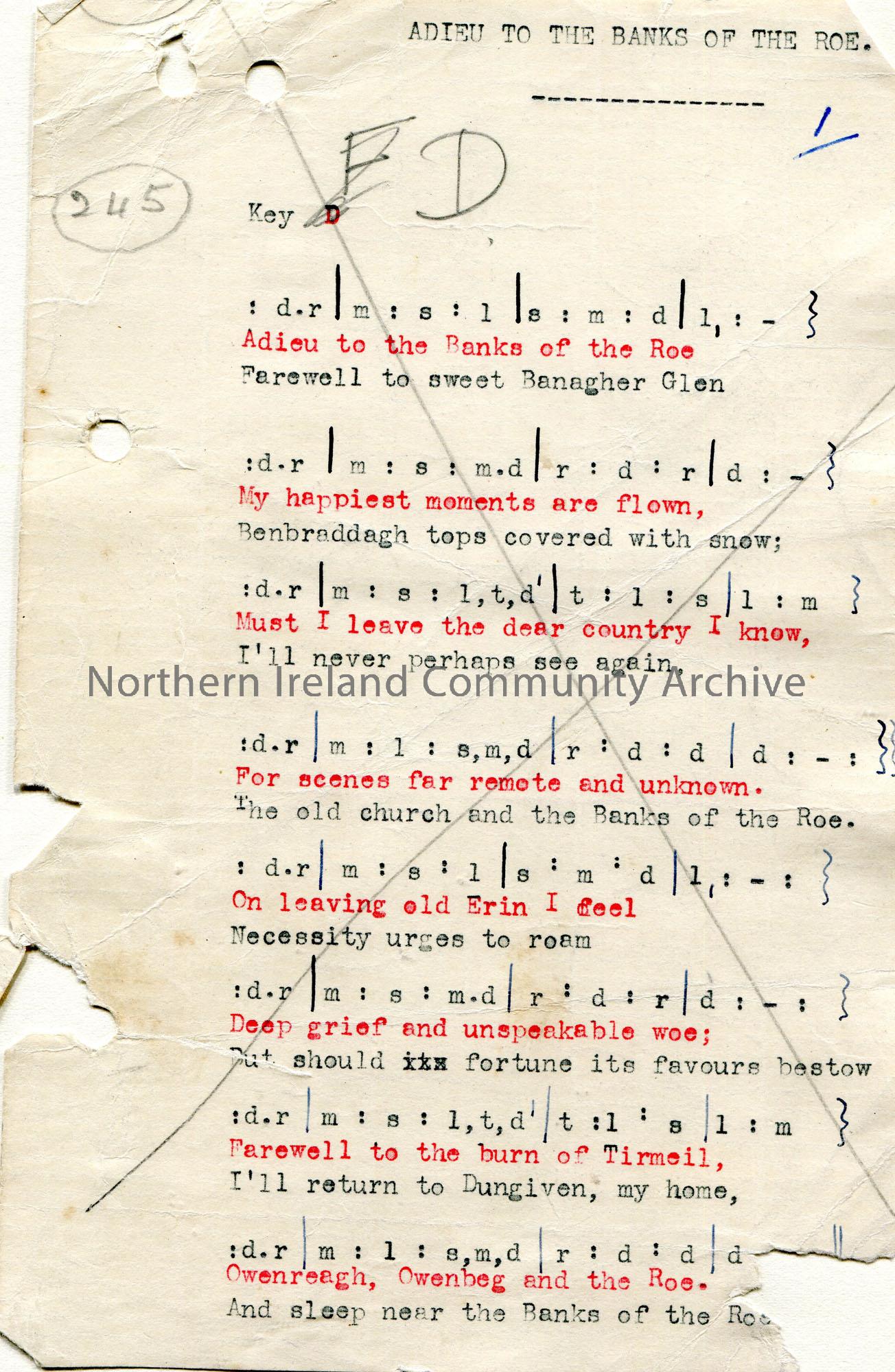 Typed tonic sol-fa notation and words to song titled, ‘Adieu to the Banks of the Roe’. This has been scored through in pencil.