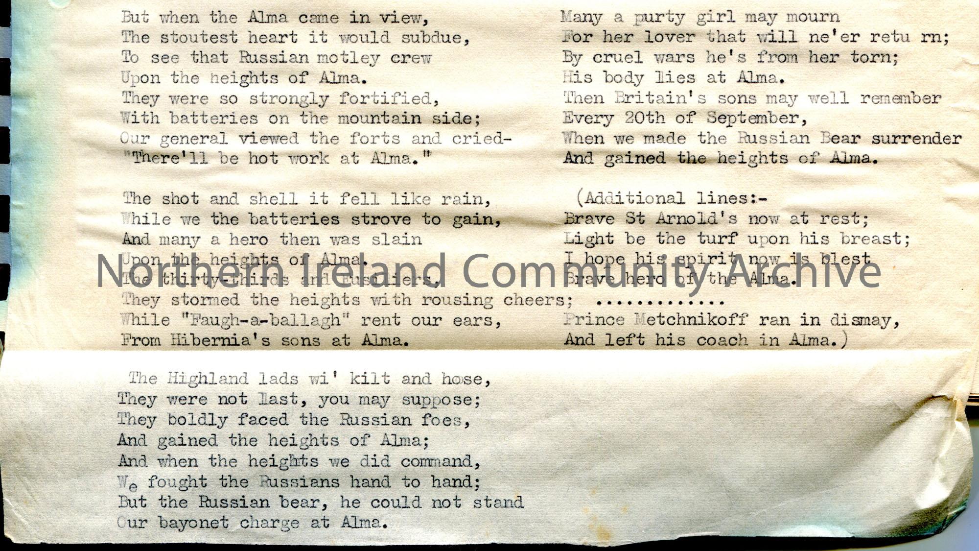 Typed tonic sol-fa notation and words to song titled, ‘No. 123 – The Heights of Alma’. Composed by James Maxwell, a schoolmaster at Dungiven, who marr… – Scan039A