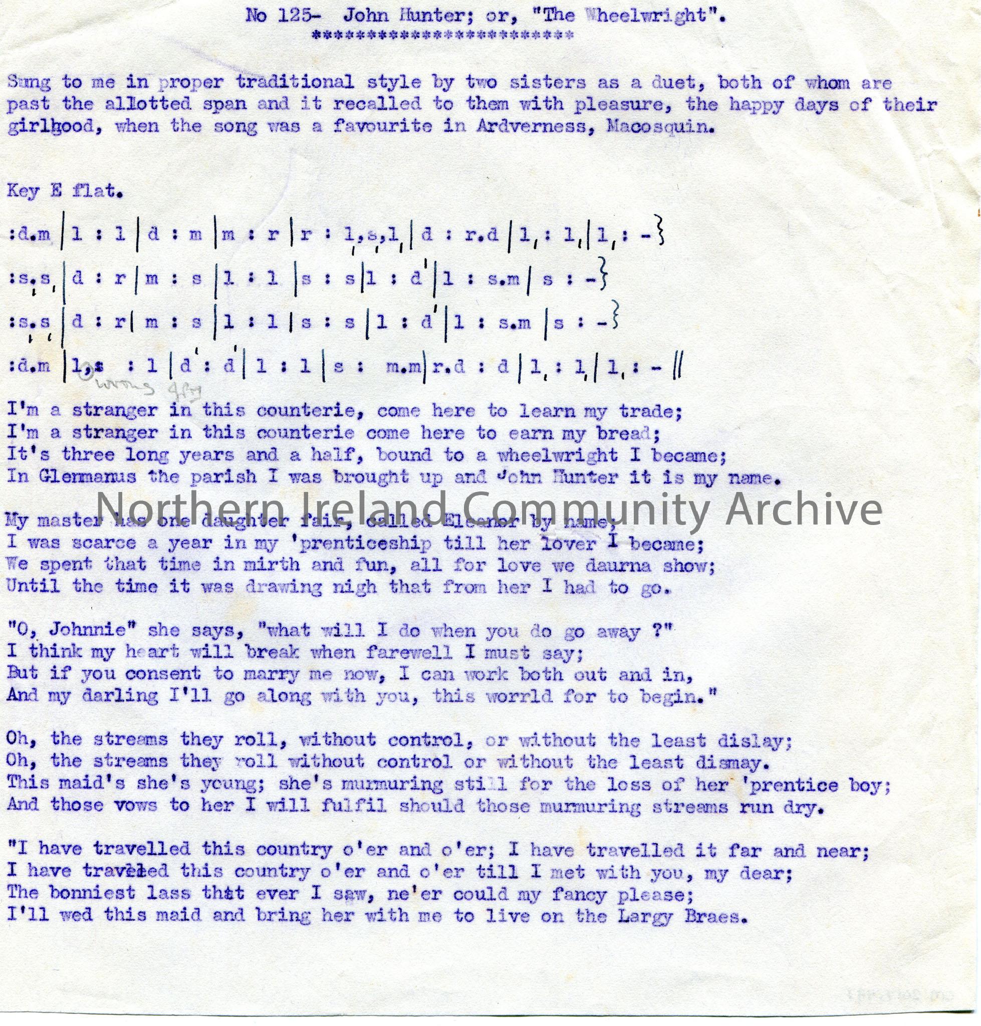 Typed tonic sol-fa notation and words to song titled, 'No. 125 - John Hunter; or, 'The Wheelwright''. The song was a favourite in Ardverness, Macosquin. Five verses.