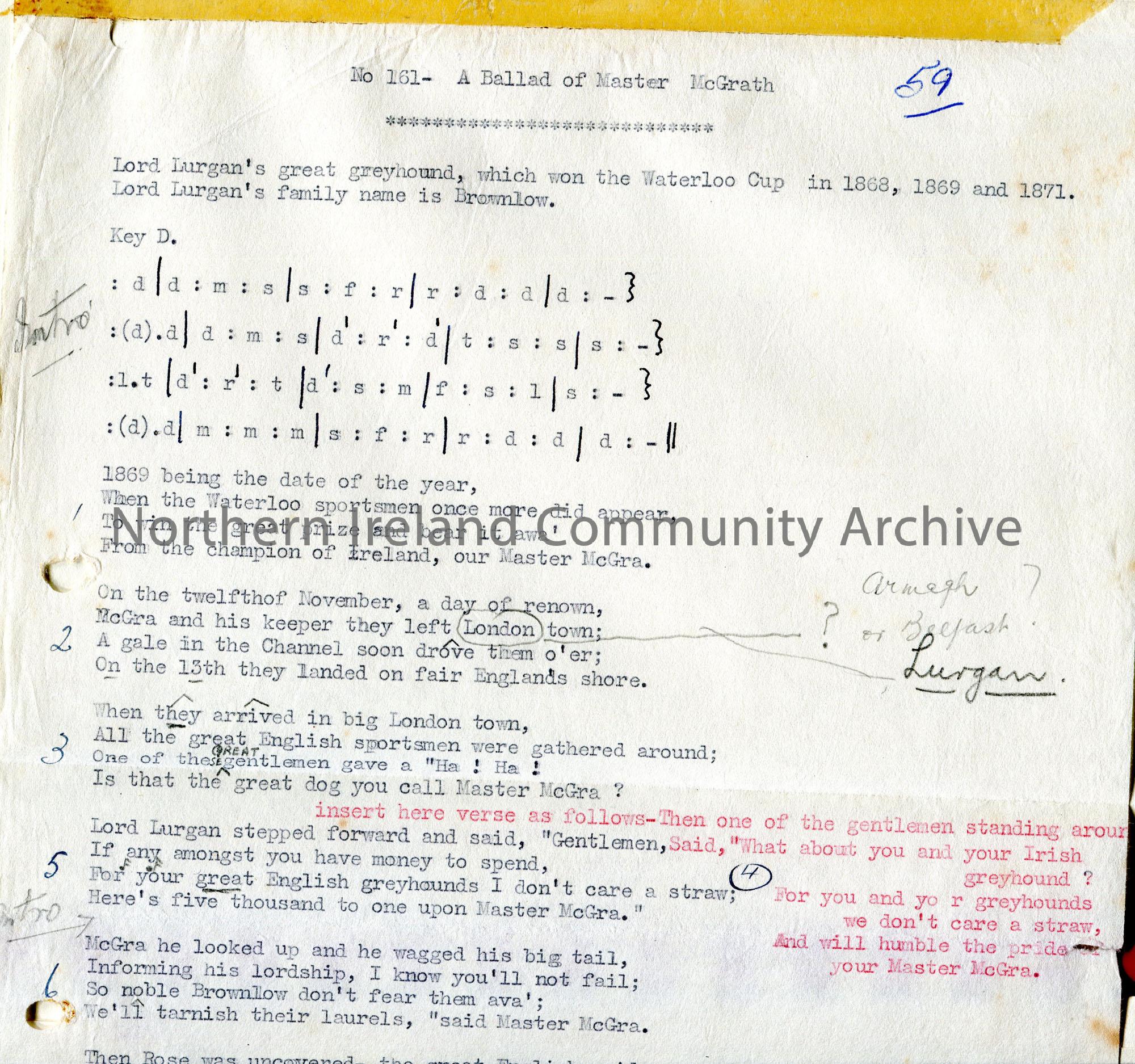 Typed tonic sol-fa notation and words to song titled, 'No. 161 - A Ballad of Master McGrath'. Annotated in pencil - note to omit verses, additional verse typed in red.