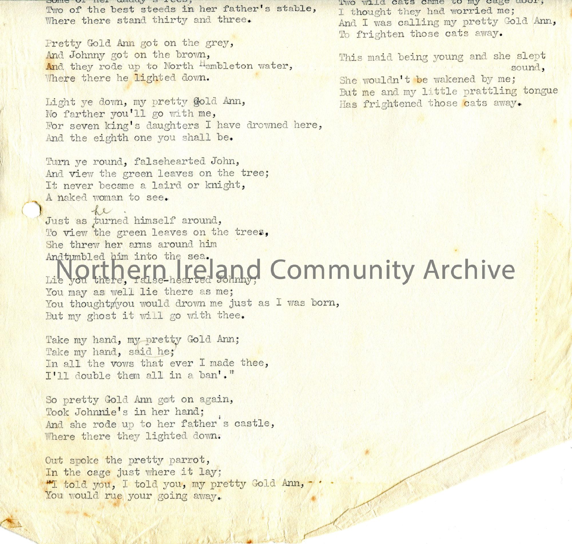 Typed tonic sol-fa notation and words to song titled, 'No. 163 - The King O' Spain's Daughter'. From Willie Hegarty, Ballydevitt, who learnt it from the girls in the 'stove' at Mullaghmore Bleach Green (Barkley's Green) when he was a young man. This is the Ulster Version of the very old Scottish ballad, May Colvin.