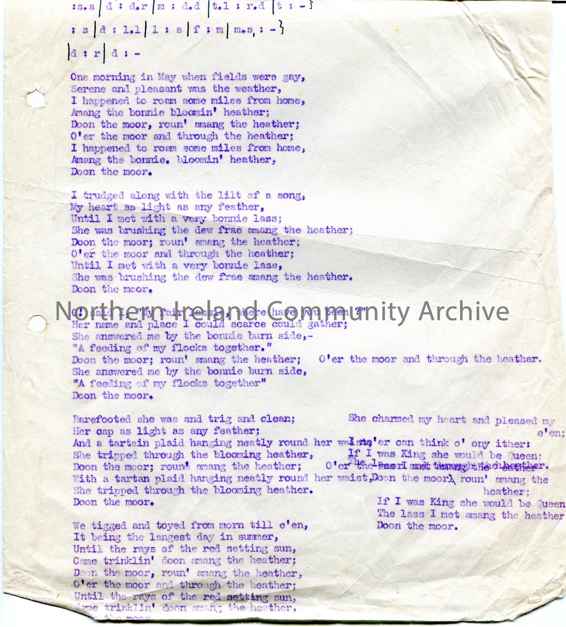 Typed tonic sol-fa notation and words to song titled, ‘No. 177 – O’er the Moor Amang the Heather’. Collected from John Barker of Mayoghill, Garvagh. N… – scan286b