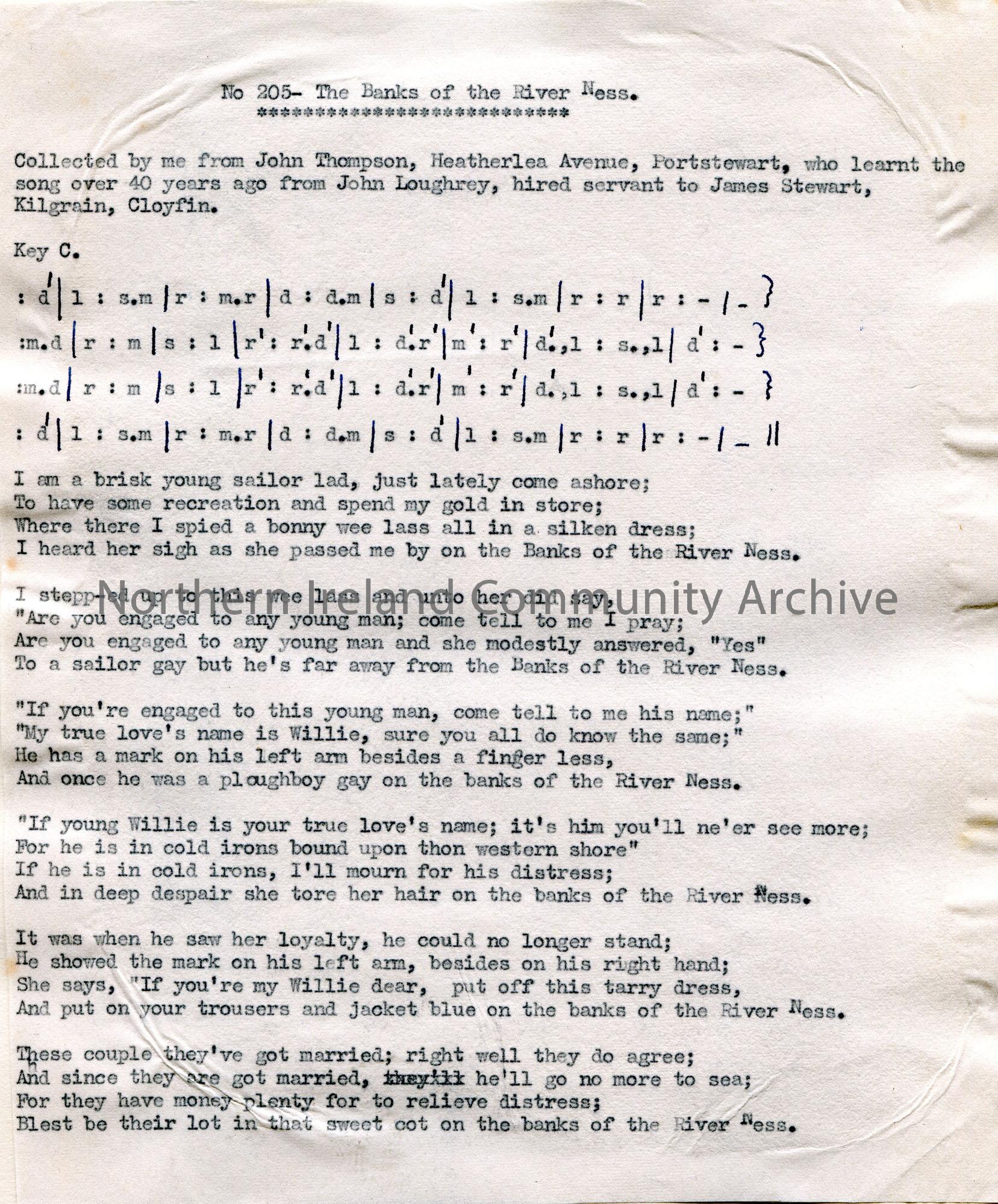Typed tonic sol-fa notation and words to song titled, 'No. 205 - The Banks of the River Ness'. Song collected from John Thompson, Heatherlea Avenue, Portstewart, who learnt the song from John Loughrey, a hired servant of James Stewart, Kilgrain, Cloyfin, Coleraine.