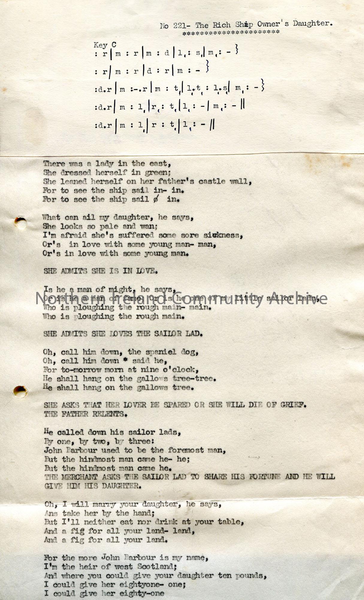 Typed tonic sol-fa notation and words to song titled, ‘No. 221 – The Rich Ship-Owner’s Daughter’.