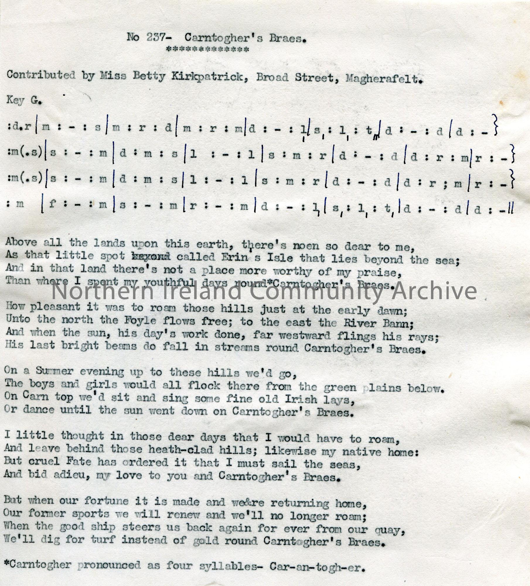 Typed tonic sol-fa notation and words to song titled, ‘No. 237 – Carntogher’s Braes’. Contributed by Miss Betty Kirkpatrick, Broad Street, Magherafelt…