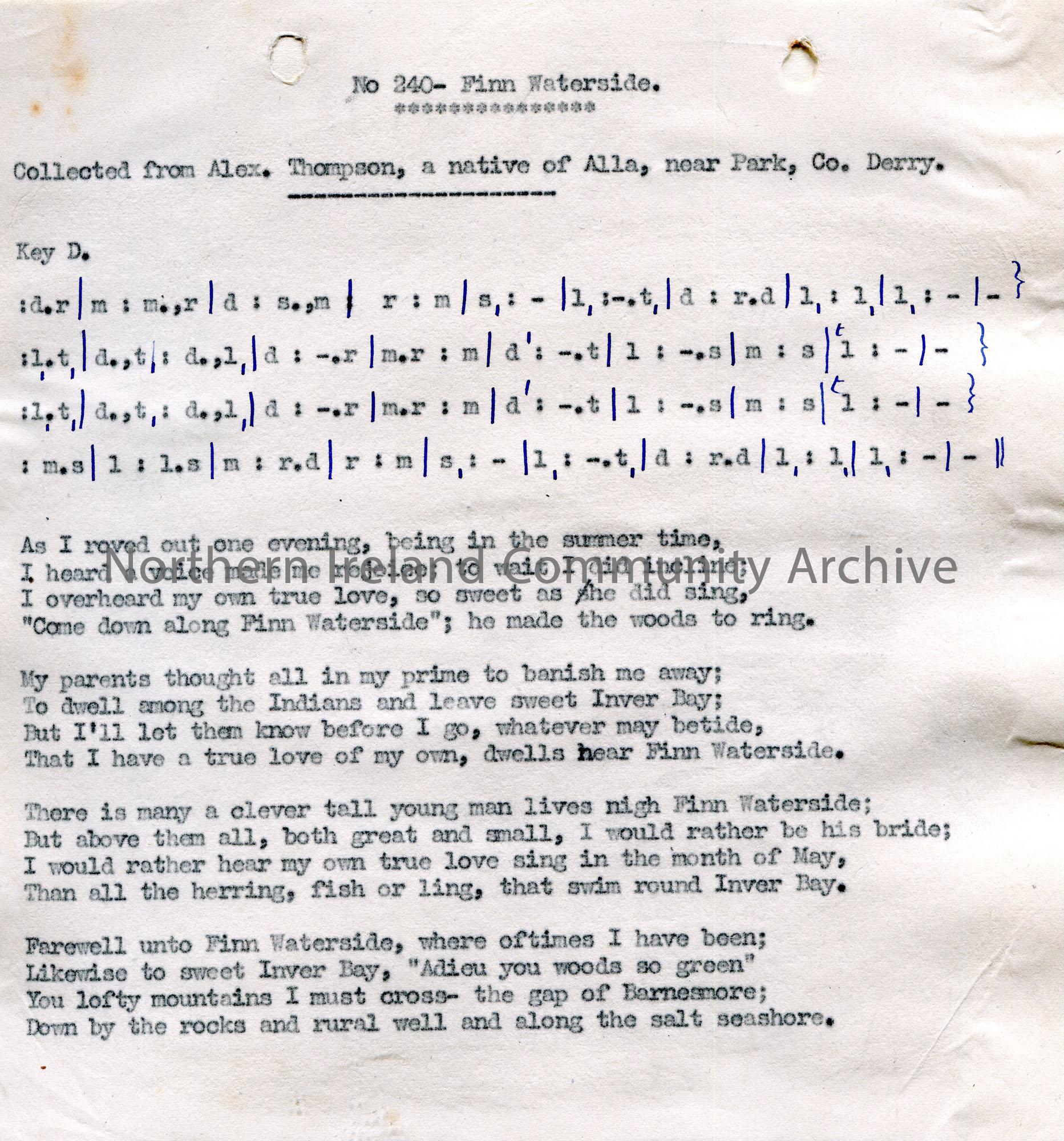 Typed tonic sol-fa notation and words to song titled, ‘No. 240 – Finn Waterside’. Contributed by a native of Alla, near Park, Co. Derry.