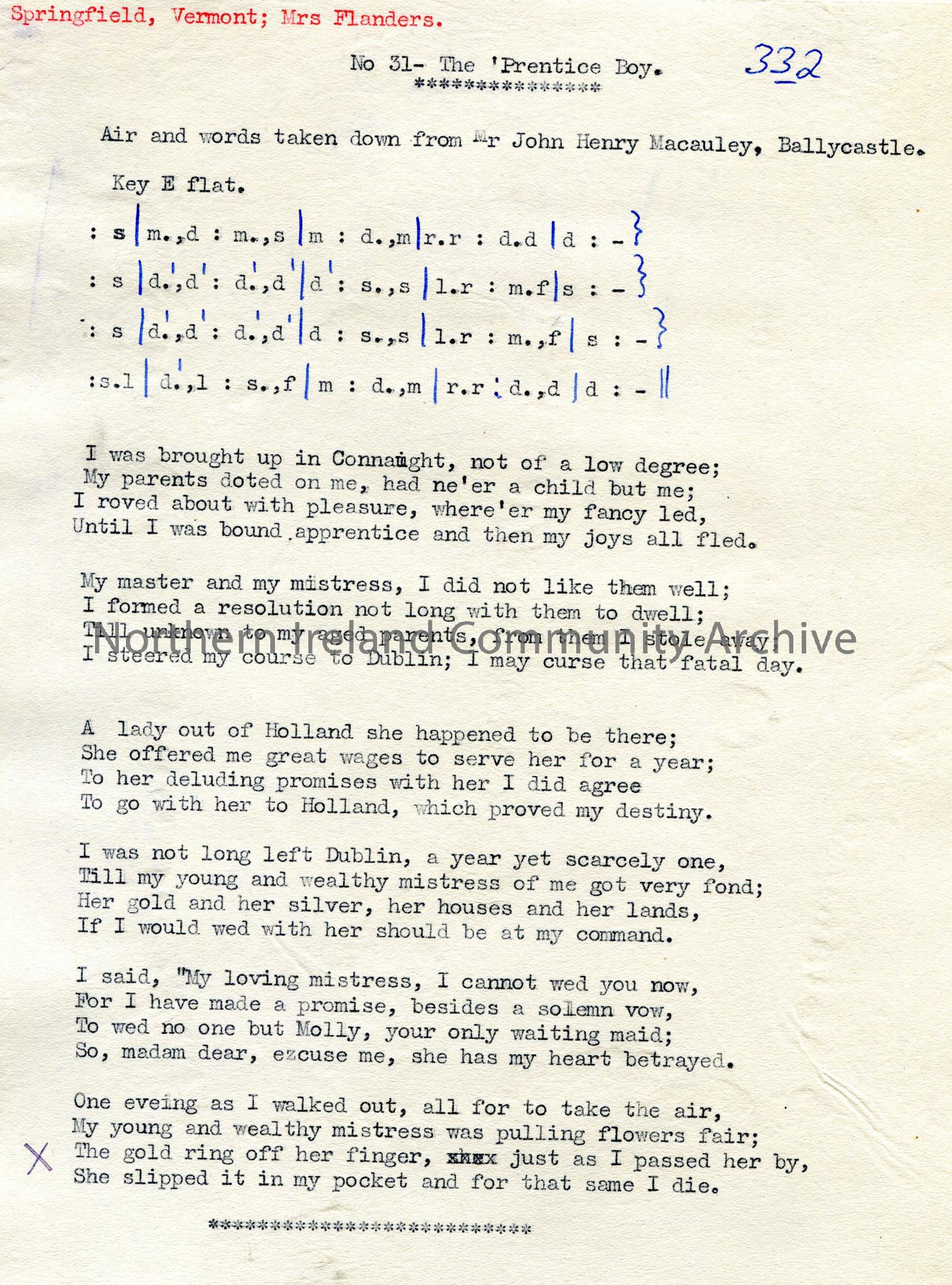 Typed tonic sol-fa notation and words to song titled, 'No. 31 - The 'Prentice Boy'. Air and words from John Henry Macauley, Ballycastle. 'Springfield, Vermont, Mrs Flanders' typed in red top of page.
