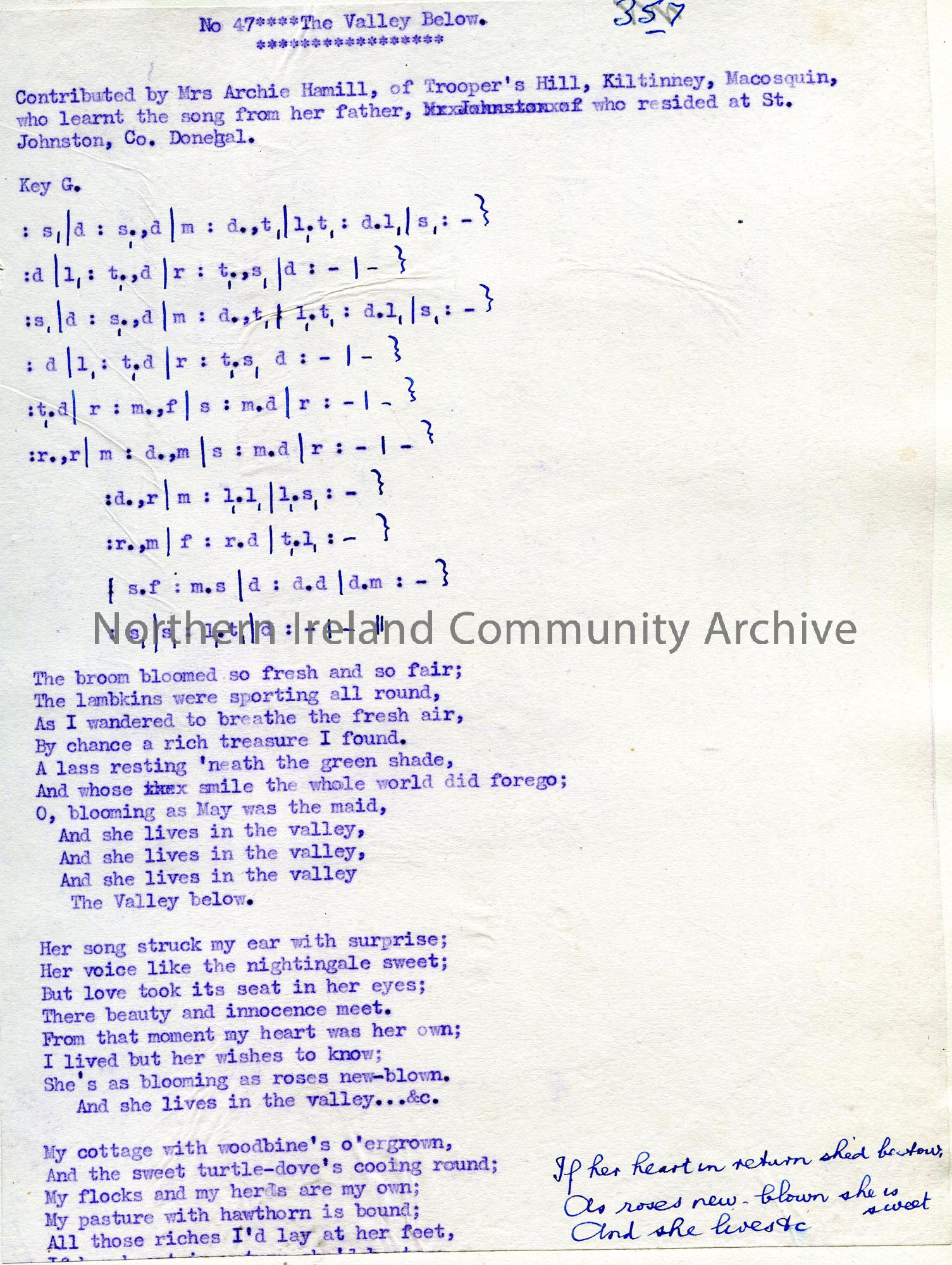 Typed tonic sol-fa notation and words to song titled, 'No. 47 - The Valley Below'. Contributed by Mrs Archie Hamill, Trooper's Hill, Kiltinney, Macosquin, who learnt the song from her father, St. Johnston, Co. Donegal.