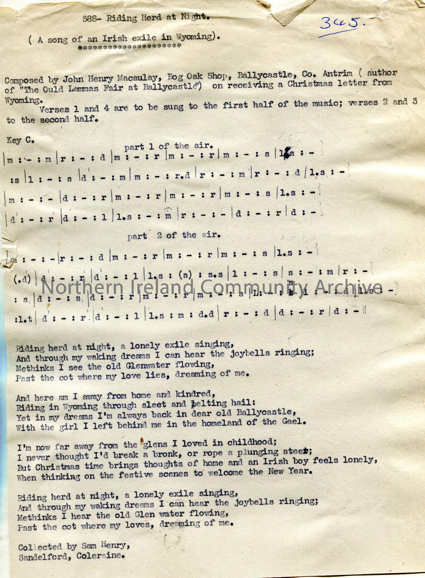Typed tonic sol-fa notation and words to song titled, 'No. 588 - Riding Herd at Night'. A song of an Irish exile in Wyoming. Composed by John Henry Macaulay, Bog Oak Shop, Ballycastle, on receiving a Christmas letter from Wyoming.