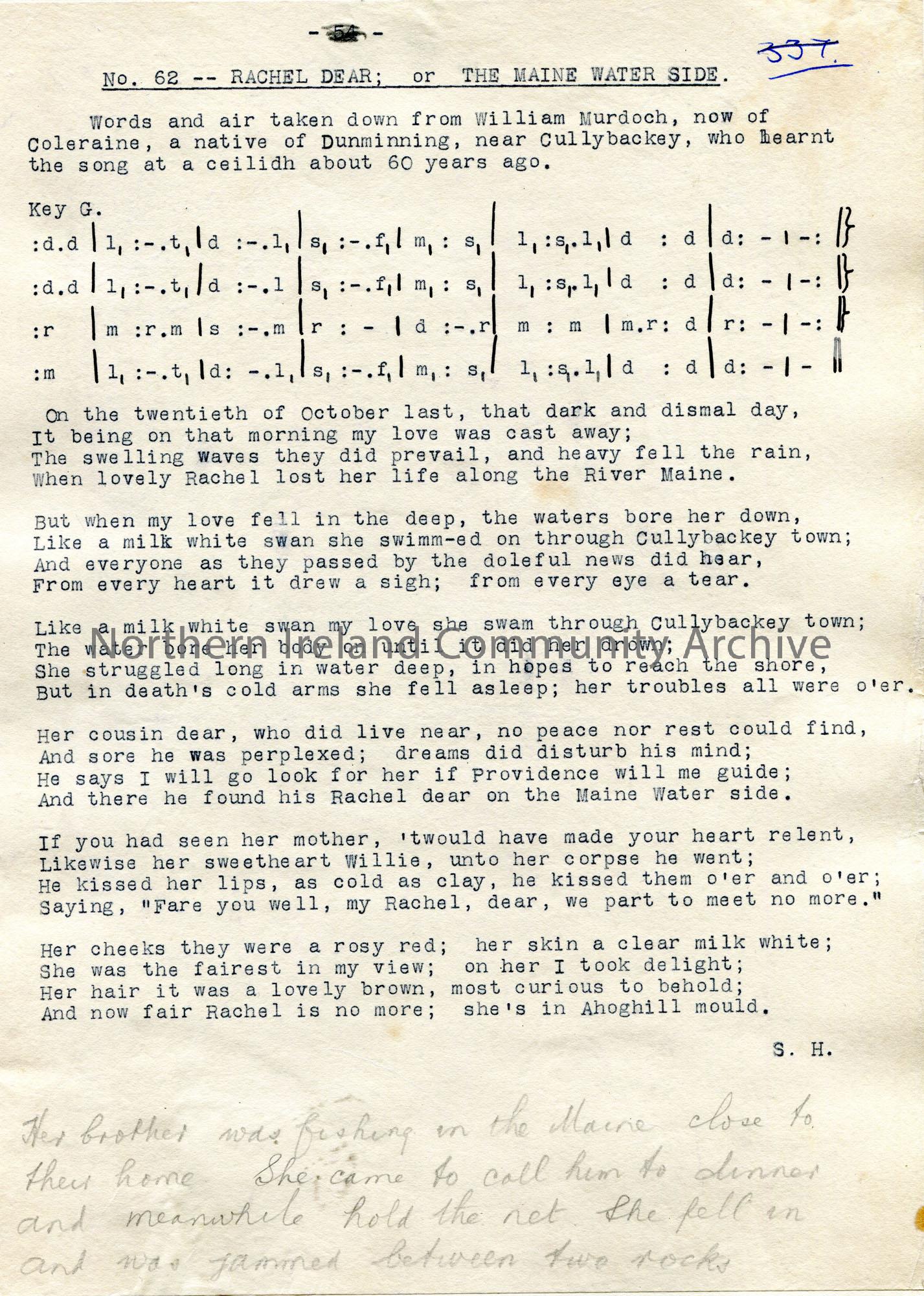 Typed tonic sol-fa notation and words to song titled, 'No. 62 - Rachel Dear or The Maine Water Side'. Words and air by William Murdoch, native of Dunminning, now Coleraine, who learnt the song at a ceilidh. Additional verse added in pencil by Sam Henry.
