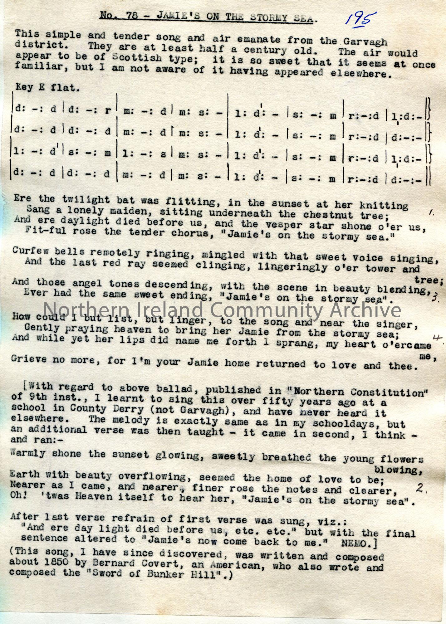 Typed tonic sol-fa notation and words to song titled, 'No. 78 - Jamie's on the Stormy Sea.' Song and air emanate from Garvagh district. Believes the air to be Scottish.