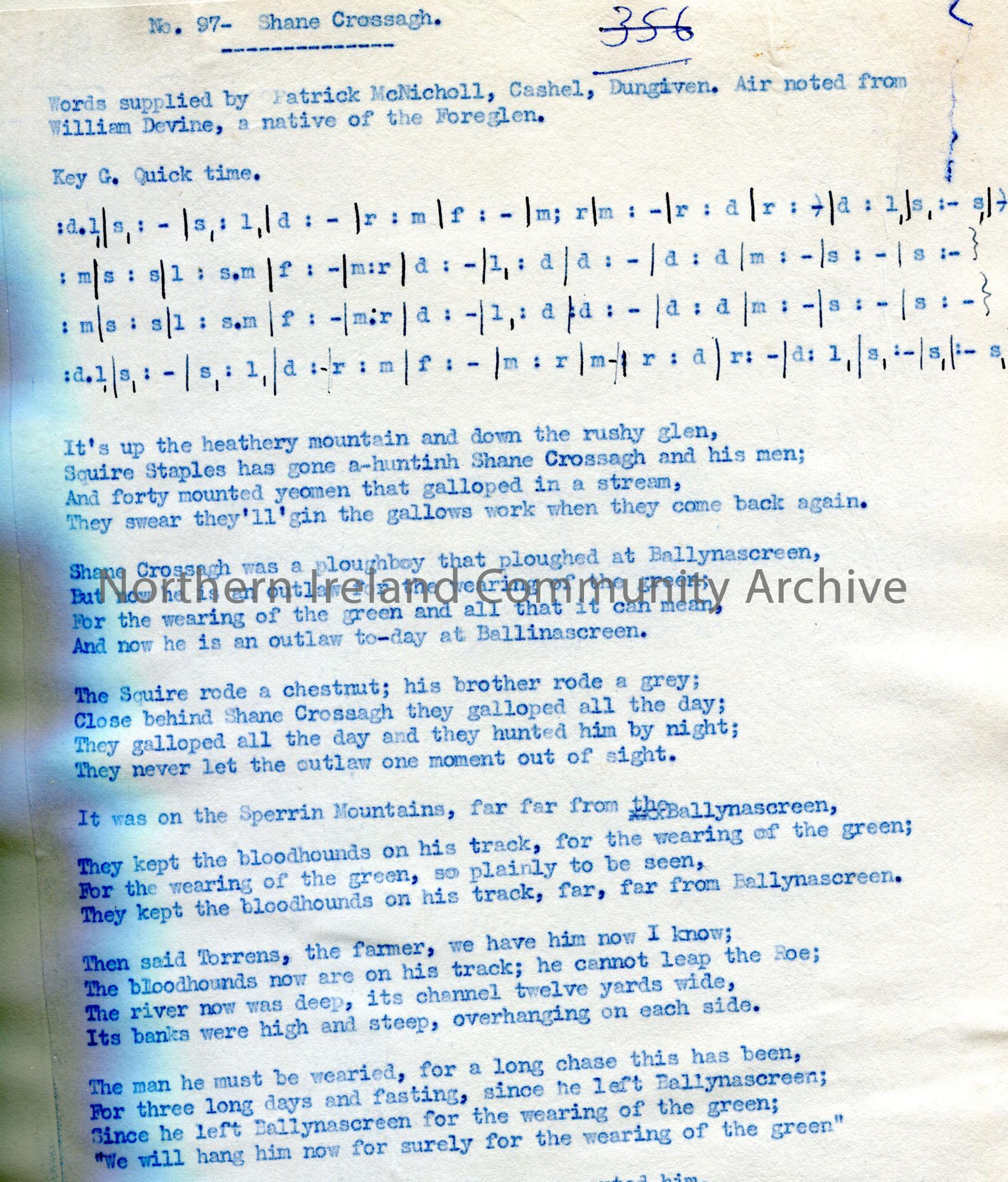 Typed tonic sol-fa notation and words to song titled, 'No. 97 - Shane Crossagh'. Words supplied by Patrick McNicholl, Cashel, Dungiven. Air noted from William Devine, a native of the Foreglen. Mentions Ballinascreen and Glenshane.