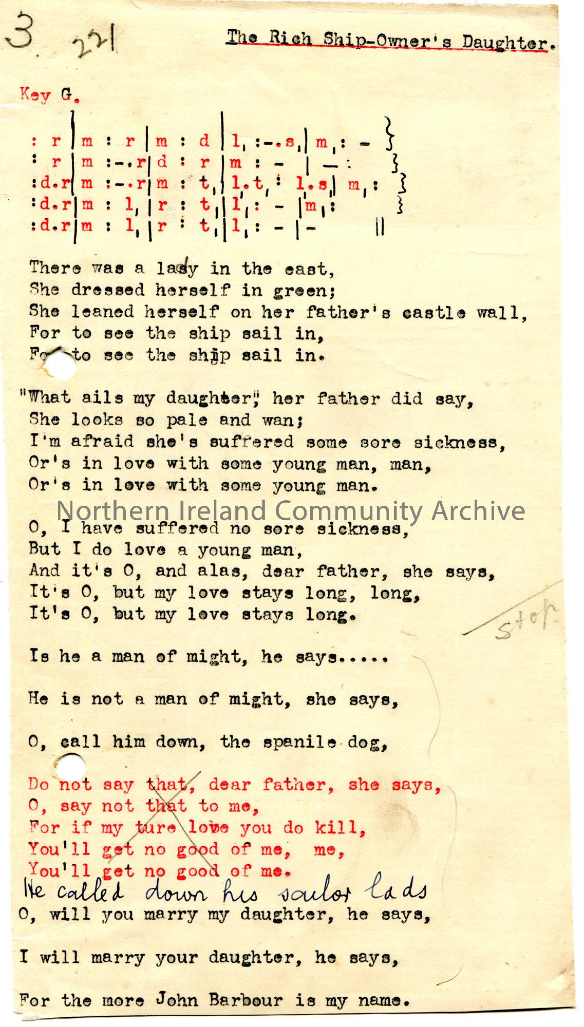 Typed tonic sol-fa notation and words to song titled, 'The Rich Ship-Owner's Daughter'. Annotated in pencil and ink. One verse, typed in red has been scored out. '3. 221' handwritten in pencil at top of page.