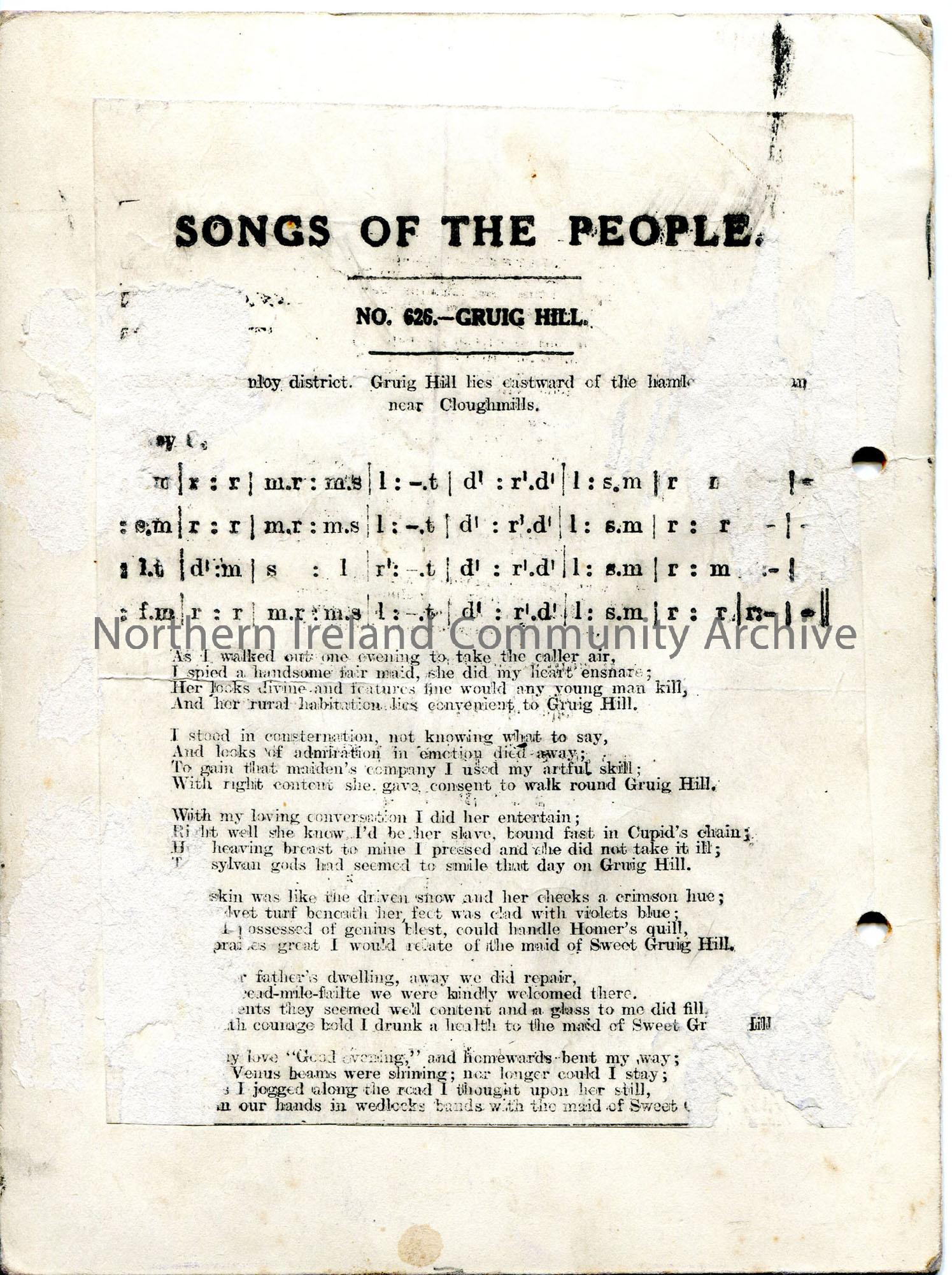 Typed tonic sol-fa notation and words to ‘The Aul’ Man’. Uses local dialect. Comical song about married life. Affixed to piece of card – on reverse, ‘… – img474