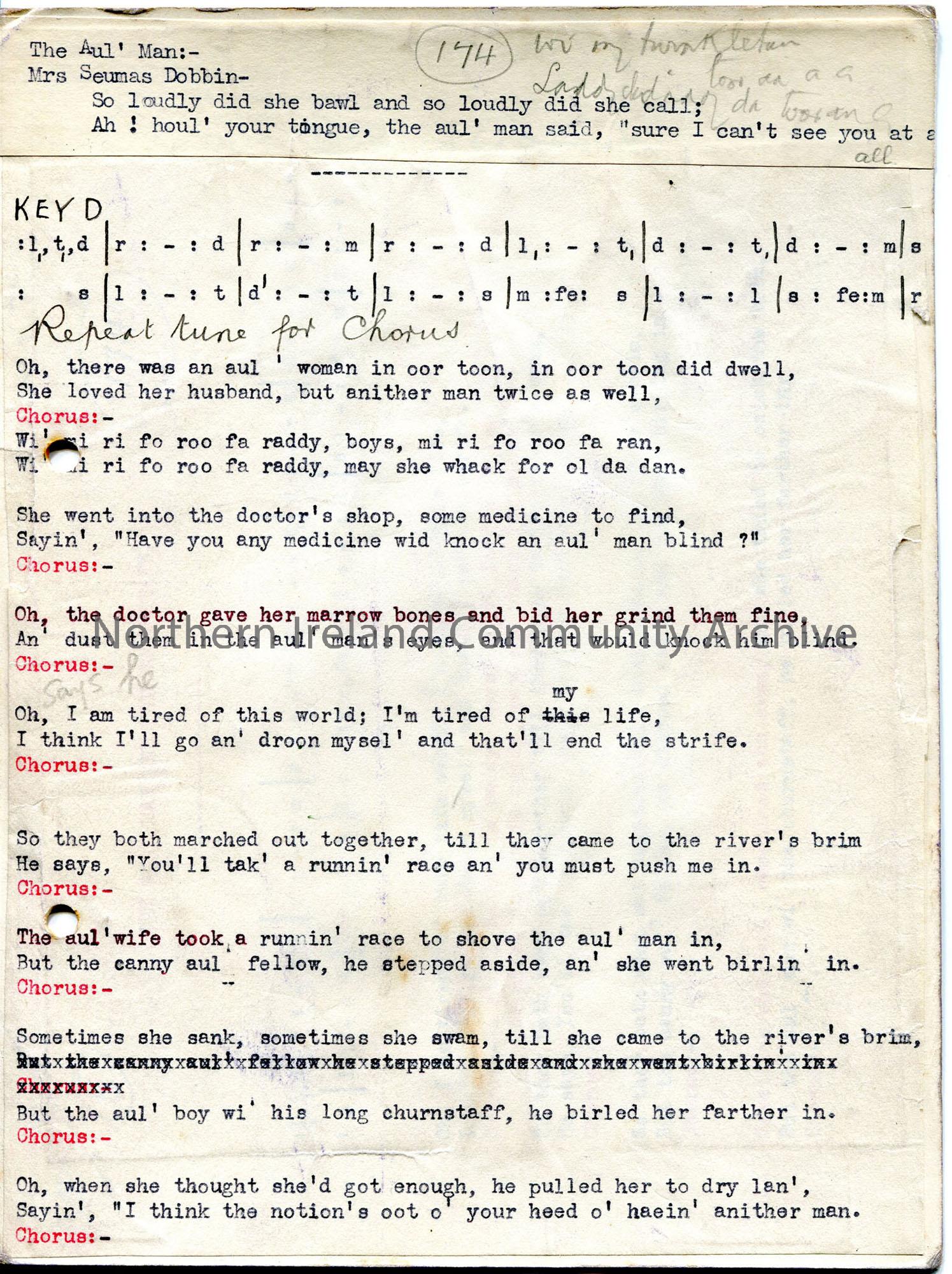 Typed tonic sol-fa notation and words to ‘The Aul’ Man’. Uses local dialect. Comical song about married life. Affixed to piece of card – on reverse, ‘…