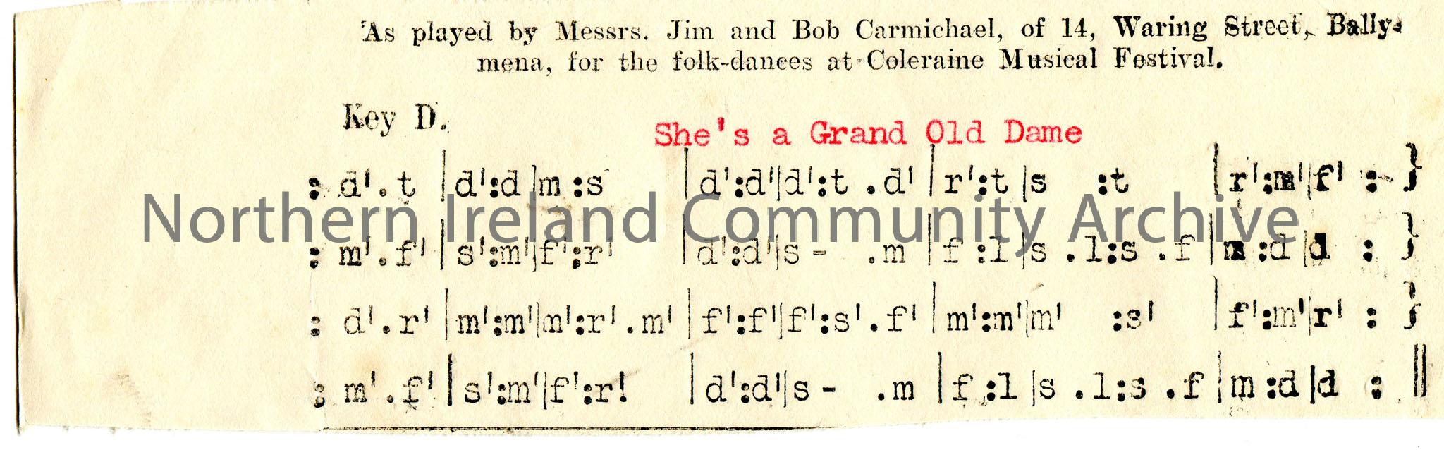 Typed tonic sol-fa notation on a strip of paper to the song ‘She’s a Grand Old Dame’. Played by Messrs Jim and Bob Carmichael, 14 Waring Street, Bally…