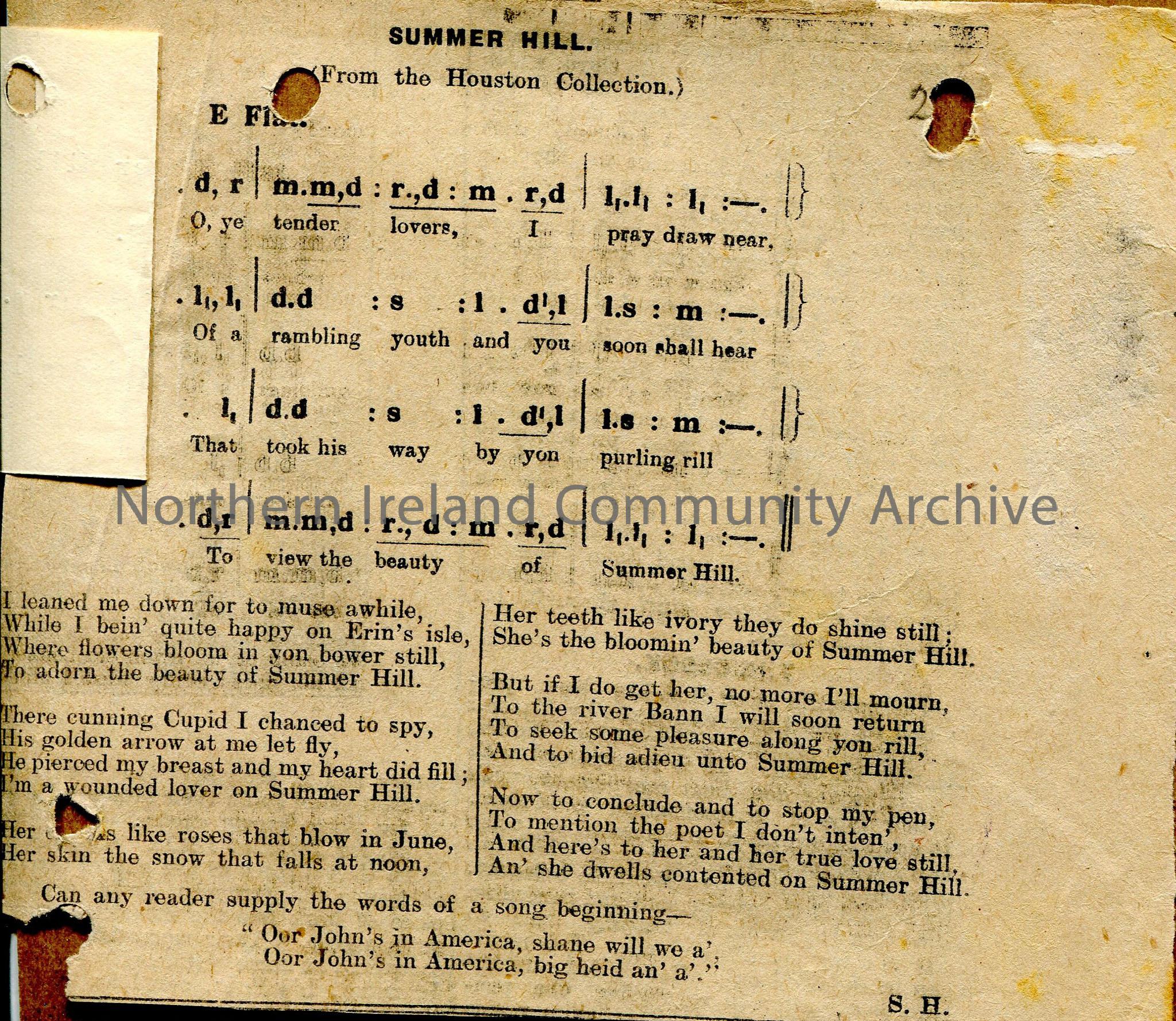 Typed tonic sol-fa notation on paper affixed to cutting with words and tonic sol-fa of alternative tune for 'Summer Hill'. Cutting carries request for remainder of 2 lines of song which uses local dialect. Mentions Bann.