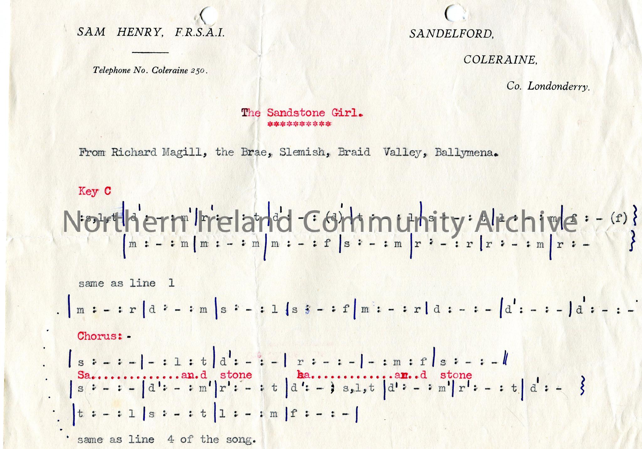 Typed tonic sol-fa notation on personal headed paper of Sam Henry to 'The Sandstone Girl'. From Richard Magill, the Brae, Slemish, Braid Valley, Ballymena.