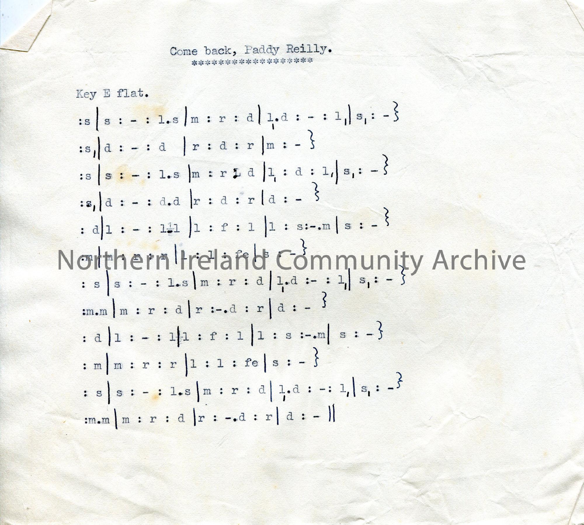 Typed tonic sol-fa notation titled, ‘Come Back, Paddy Reilly’.