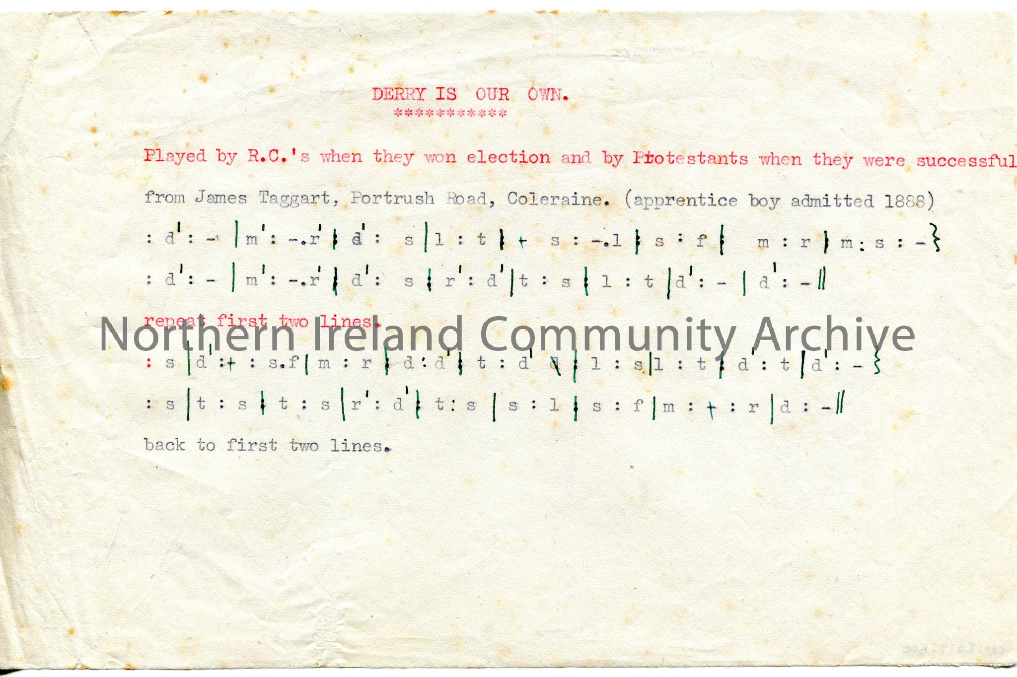 Typed tonic sol-fa notation titled, 'Derry Is Our Own'. States, 'Played by R.C's when they won election and by Protestants when they were successful. From James Taggart, Portrush Road, Coleraine. (apprentice boy admitted 1886)'.