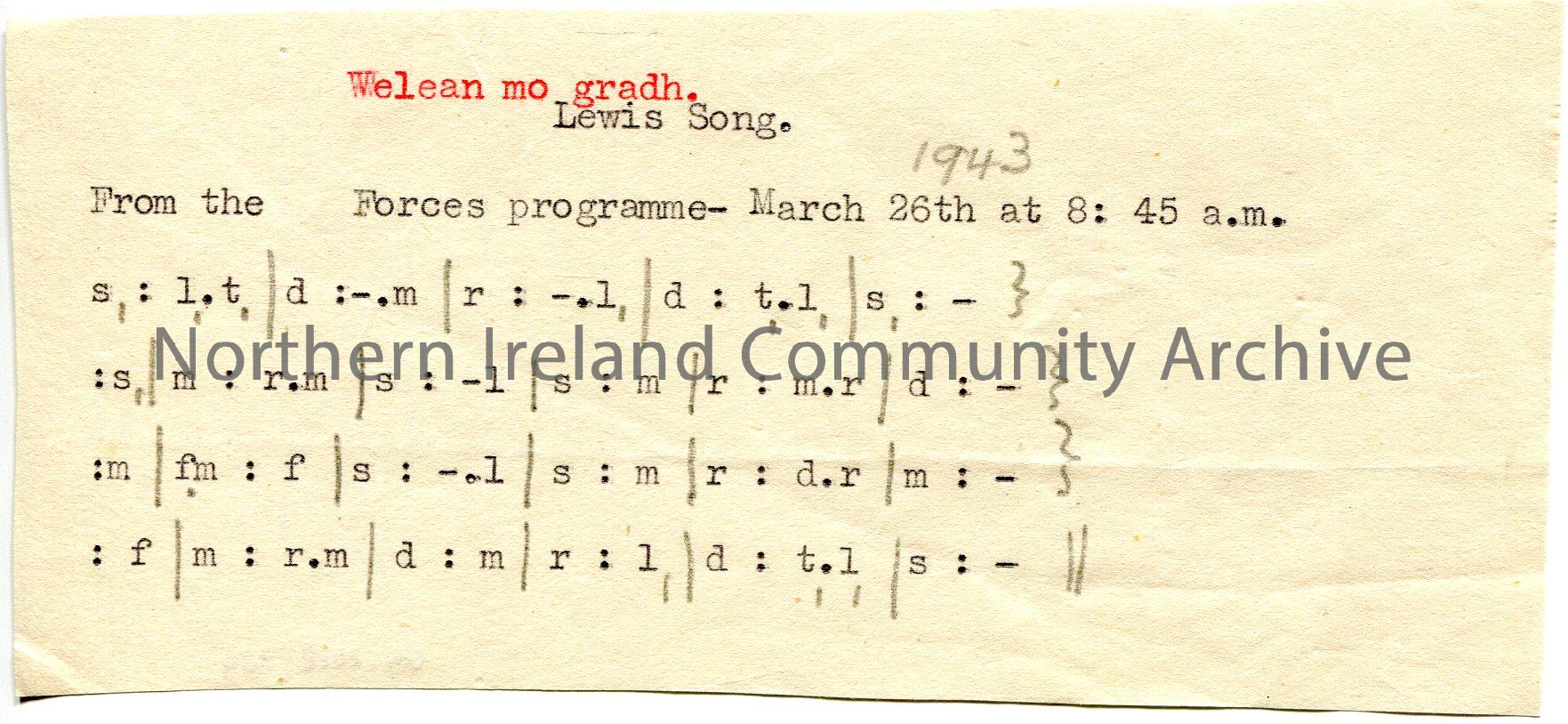 Typed tonic sol-fa notation titled, ‘Welean mo gradh. Lewis Song’. From the Forces programme. 26th March 1943 at 8:45am.