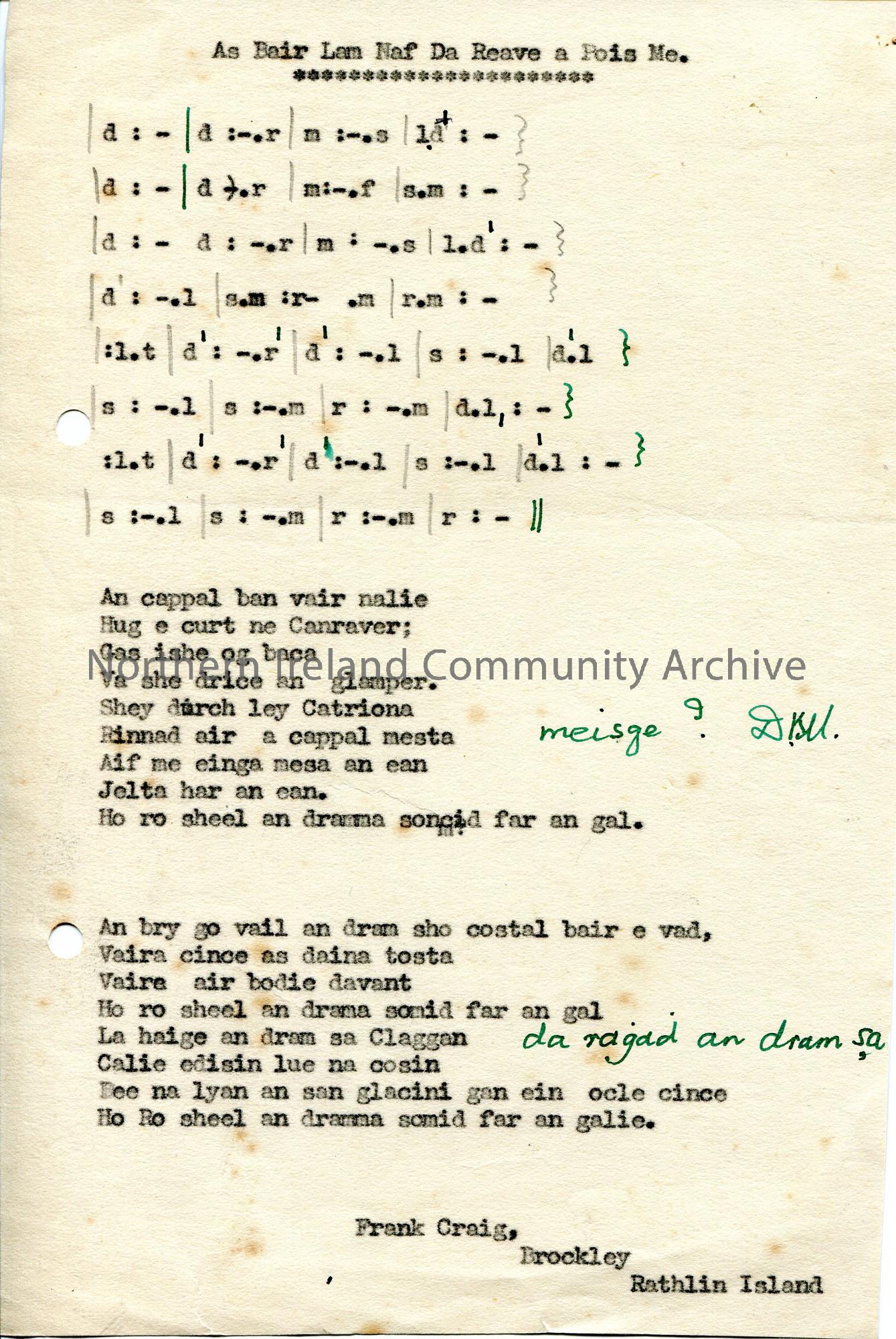Typed tonic sol-fa notation to ‘As Bair Lam Naf Da Reave a Pois Me’ from Frank Craig, Brockley, Rathlin Island. Annotated in green ink.