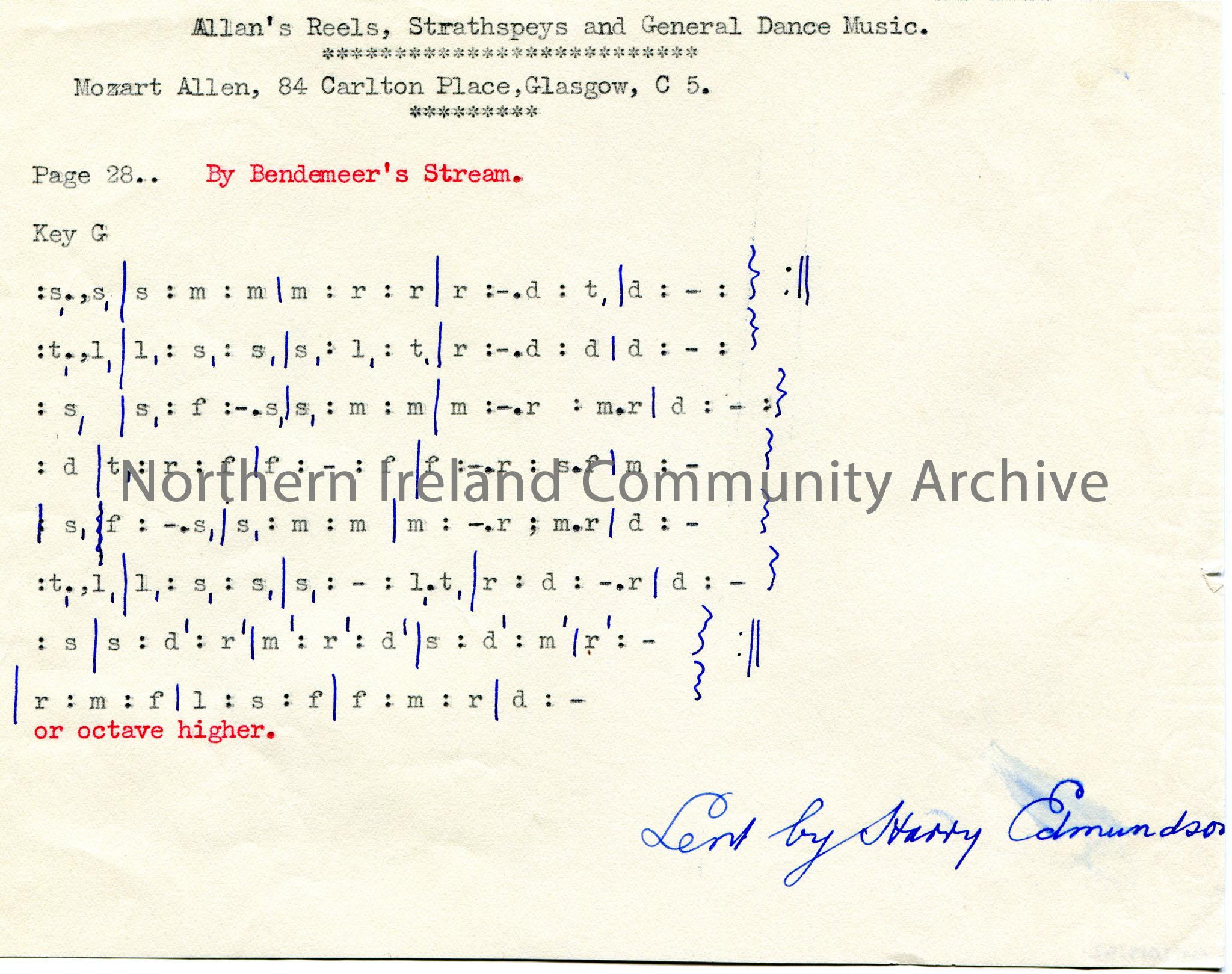 Typed tonic sol-fa notation to 'By Bendemeer's Stream'. 'Allan's Reels, Strathspeys and General Dance Music. Mozart Allen, 84 Carlton Place, Glasgow, C 5' typed at top of page. 'Sent by Harry Edmundson' written at bottom of page.