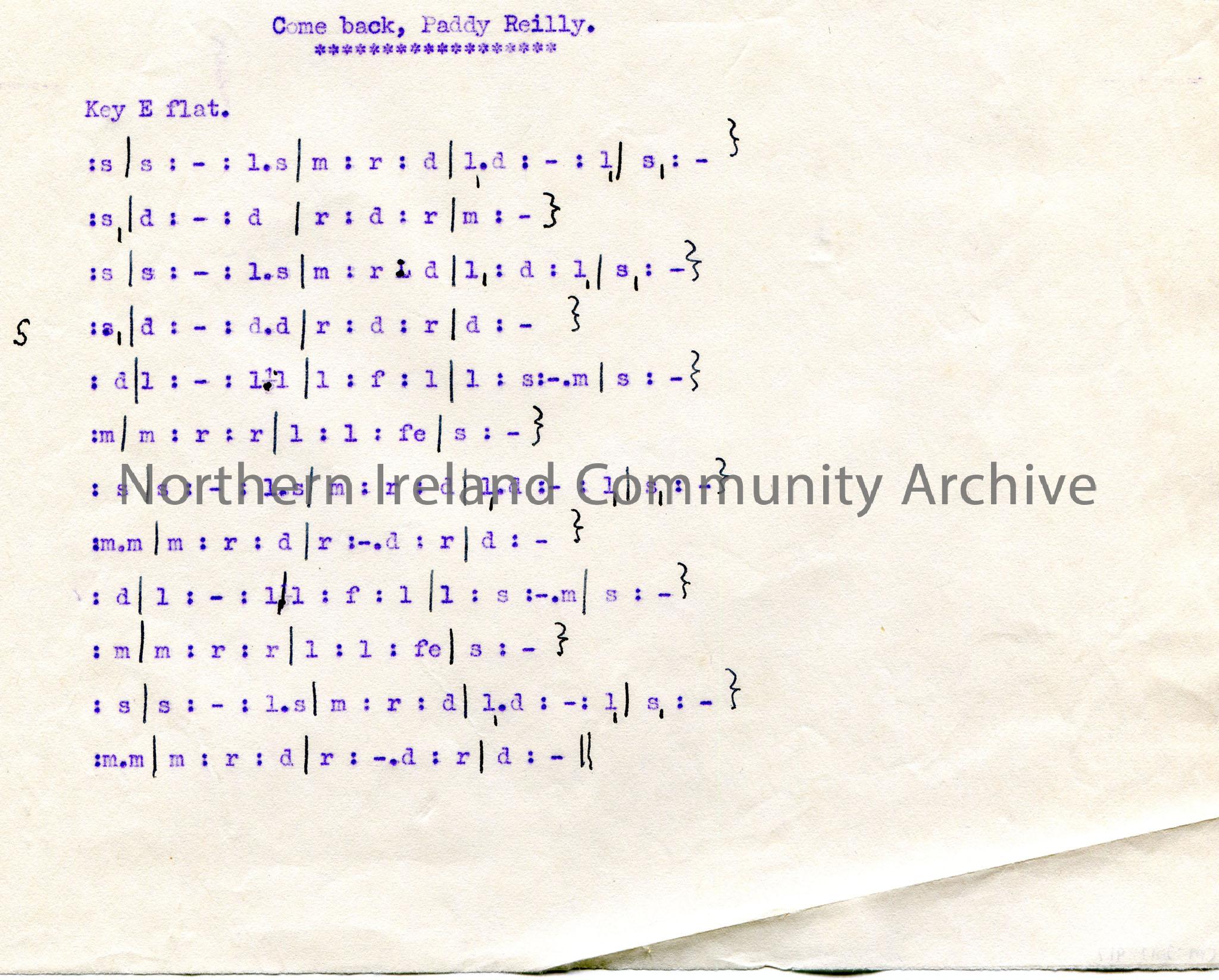 Typed tonic sol-fa notation to ‘Come back, Paddy Reilly’.