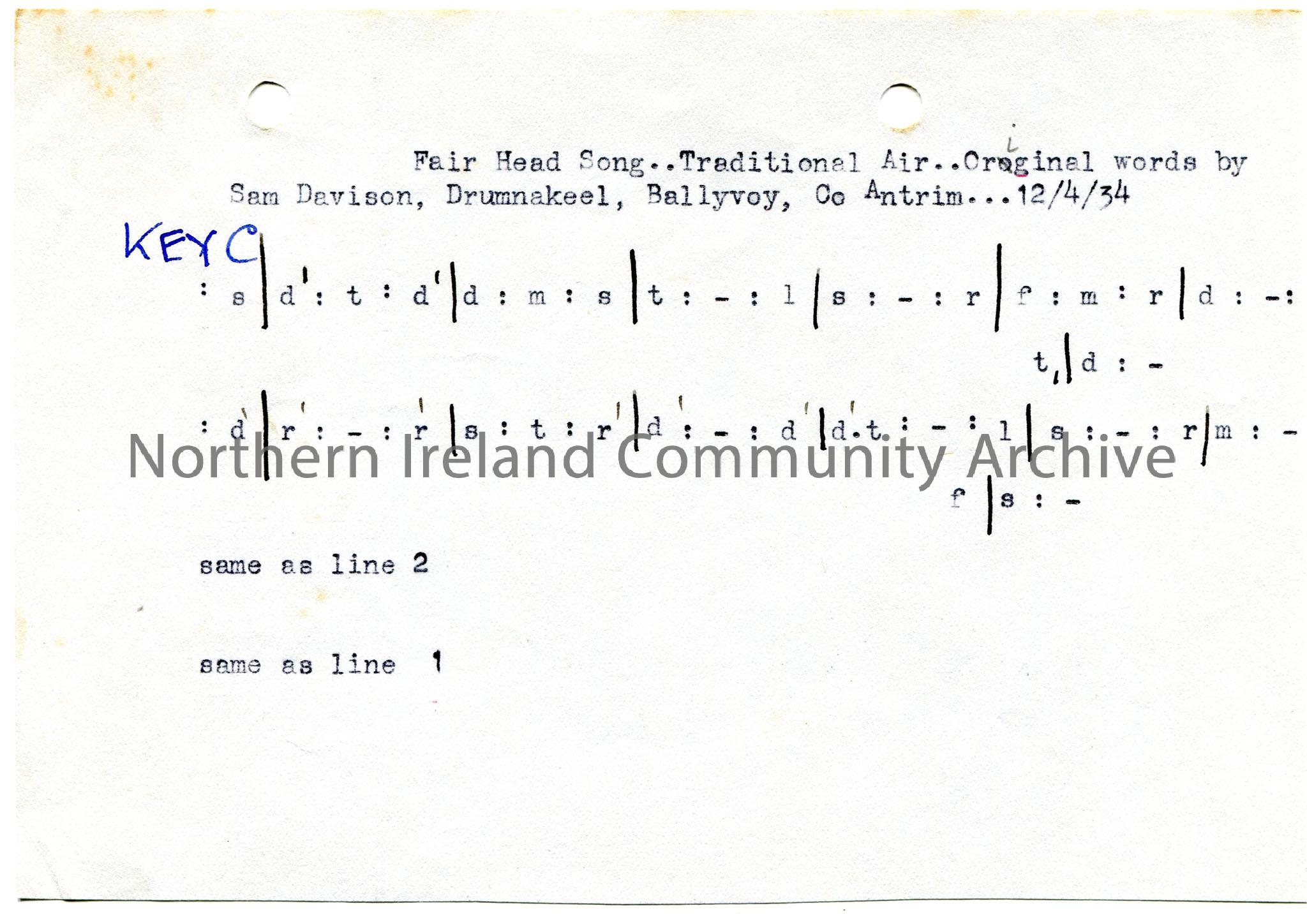 Typed tonic sol-fa notation to ‘Fair Head Song’ – traditional air