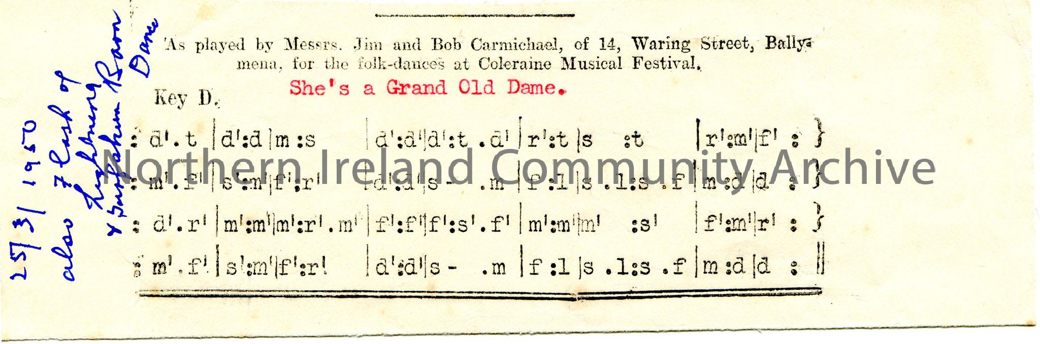 Typed tonic sol-fa notation to 'She's a Grand Old Dame'. As played by Messrs. Jim and Bob Carmichael, of 14 Waring Street, Ballymena, for the folk-dances at Coleraine Music Festival. Handwritten note states, '23/5/1950 also Flash of Lightning & Turfahun Barn Dance'.