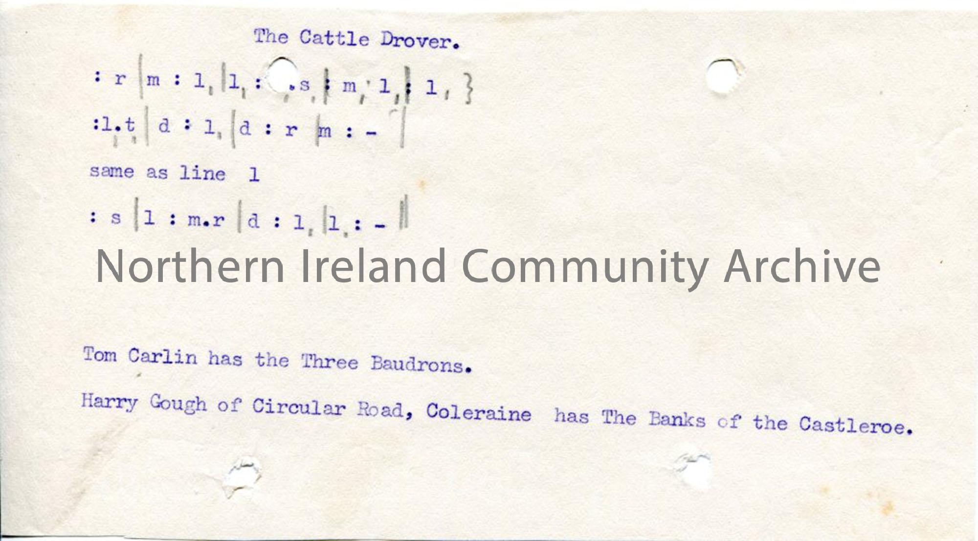 Typed tonic sol-fa notation to 'The Cattle Drover' and notes to sources of other songs.