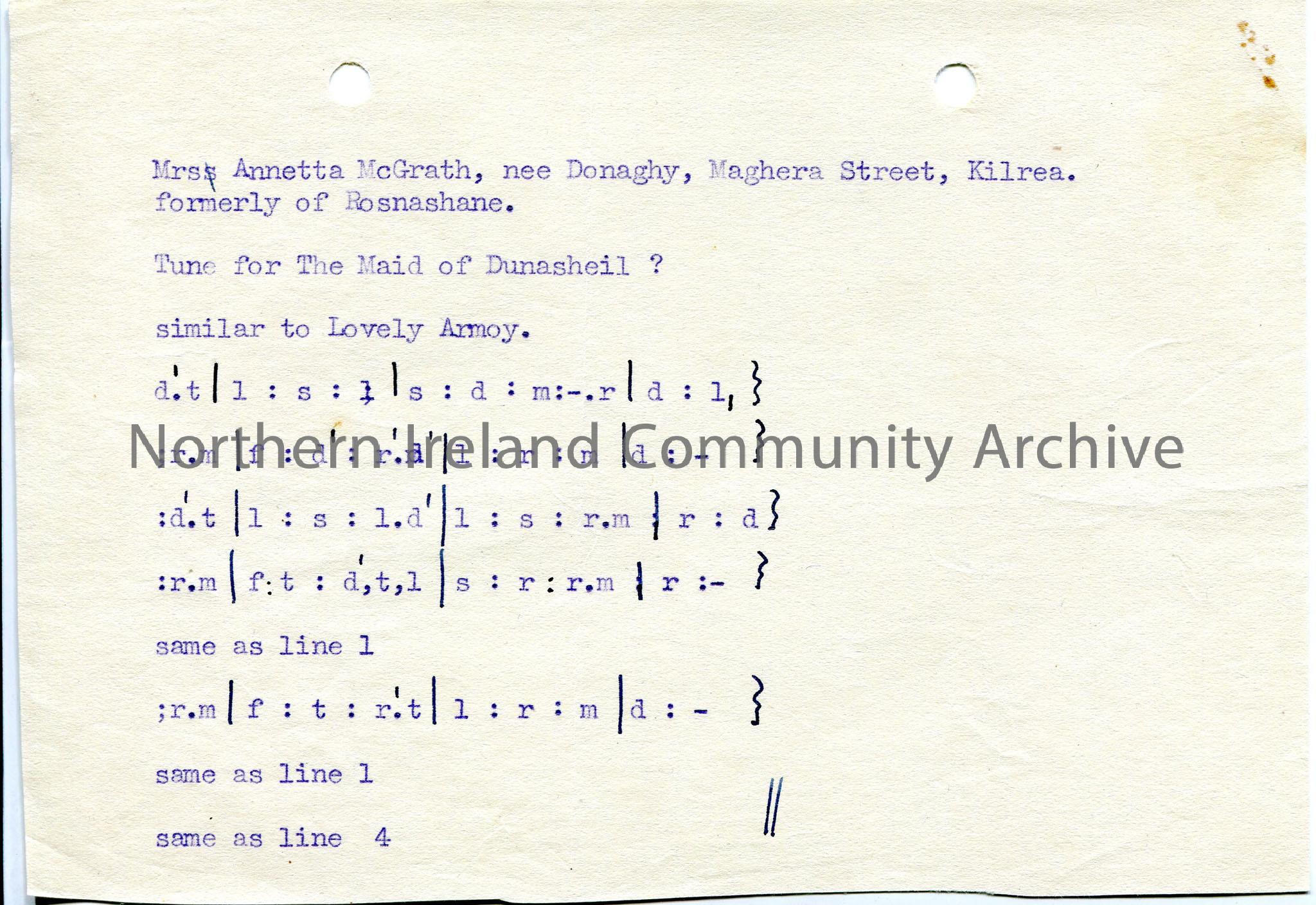 Typed tonic sol-fa notation to ‘The Maid of Dunashiel’, followed by ?. Details of donor’s origins