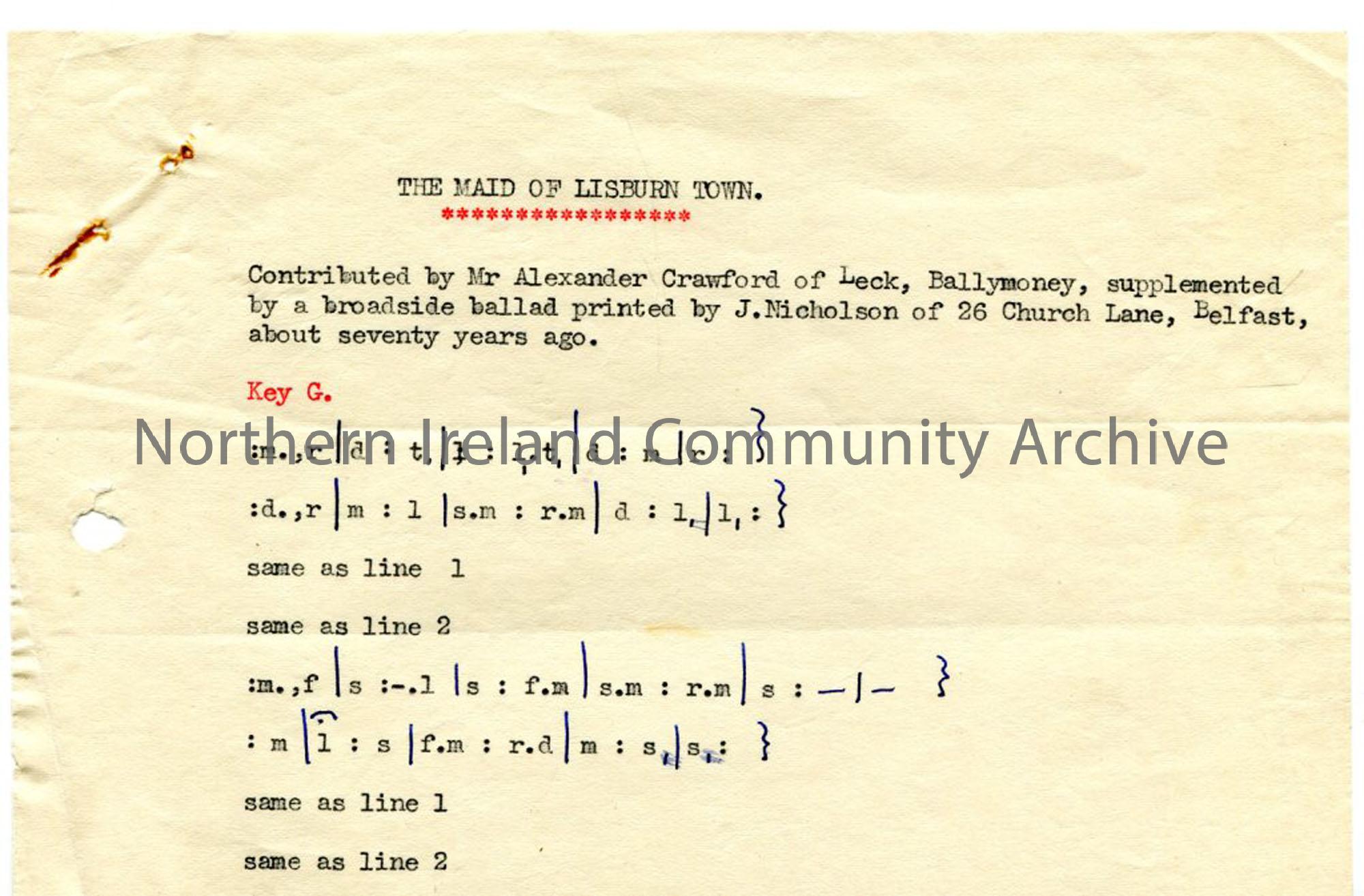Typed tonic sol-fa notation to 'The Maid of Lisburn Town'. From Alexander Crawford, Leck, Ballymoney.