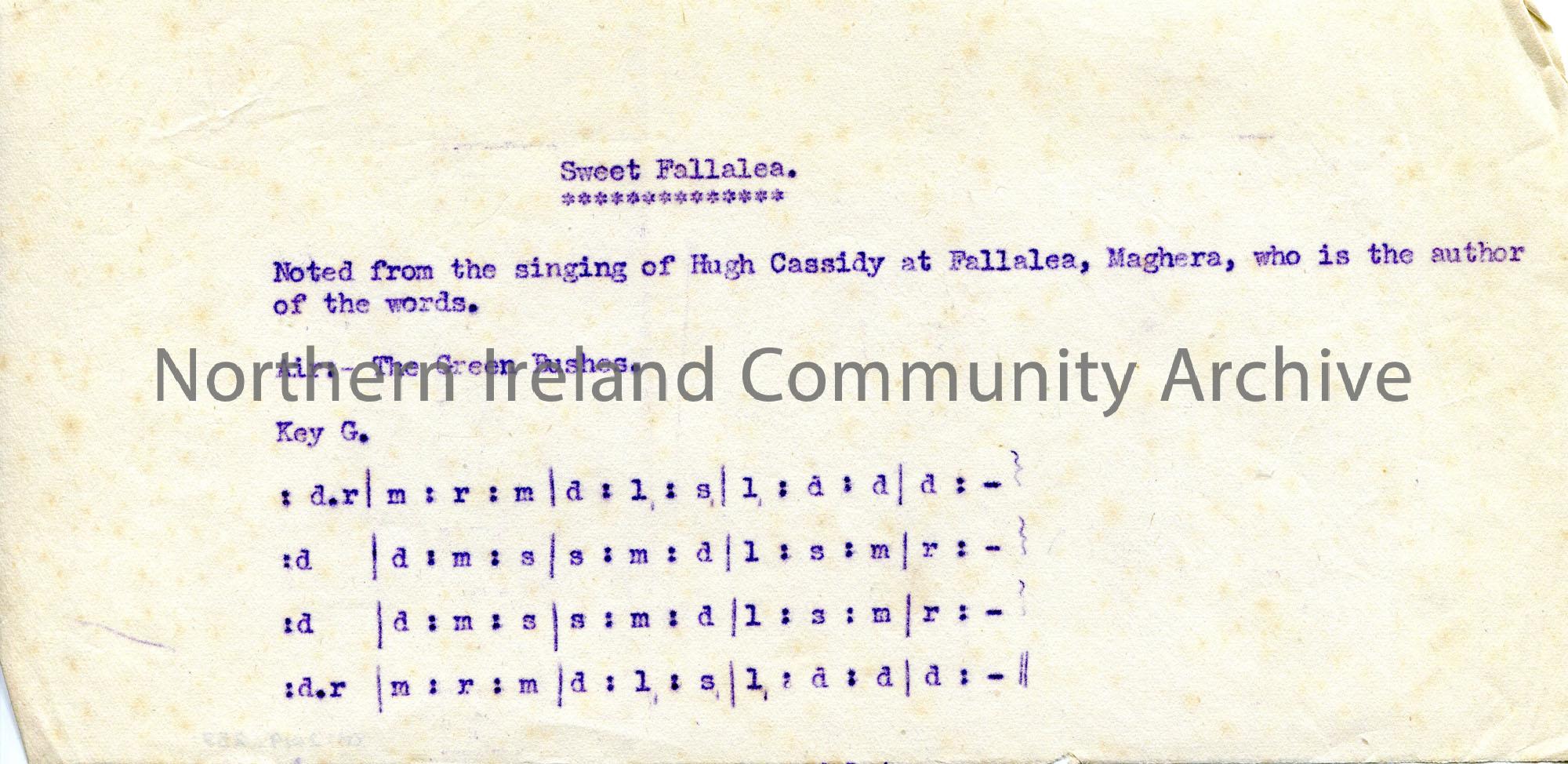 Typed tonic sol-fa notation to the song 'Sweet Fallalea'. Note on song origin - Noted from the singing of Hugh Cassidy at Fallalea, Maghera, who is the author of the words. The Air is 'The Green Bushes'.