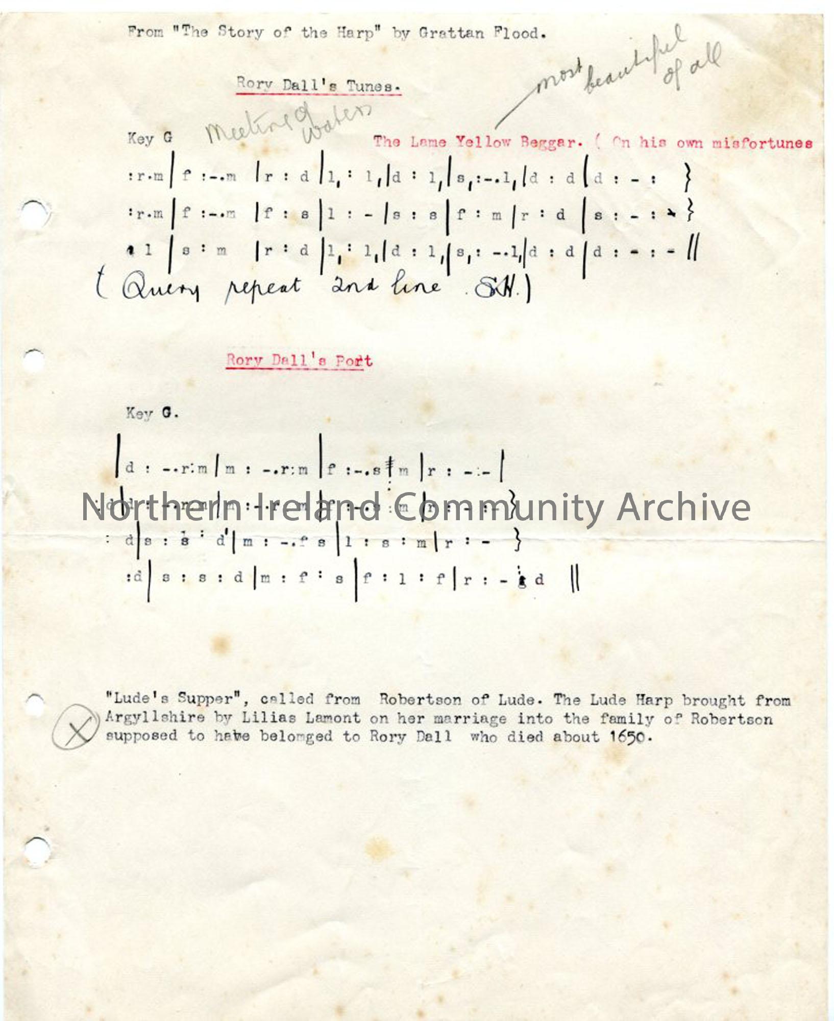 Typed tonic sol-fa notation to 2 songs - 'Rory Dall's Tunes' and 'Rory Dall's Port'. Some information re Rory Dall and ownership of Lude Harp of Argyllshire.