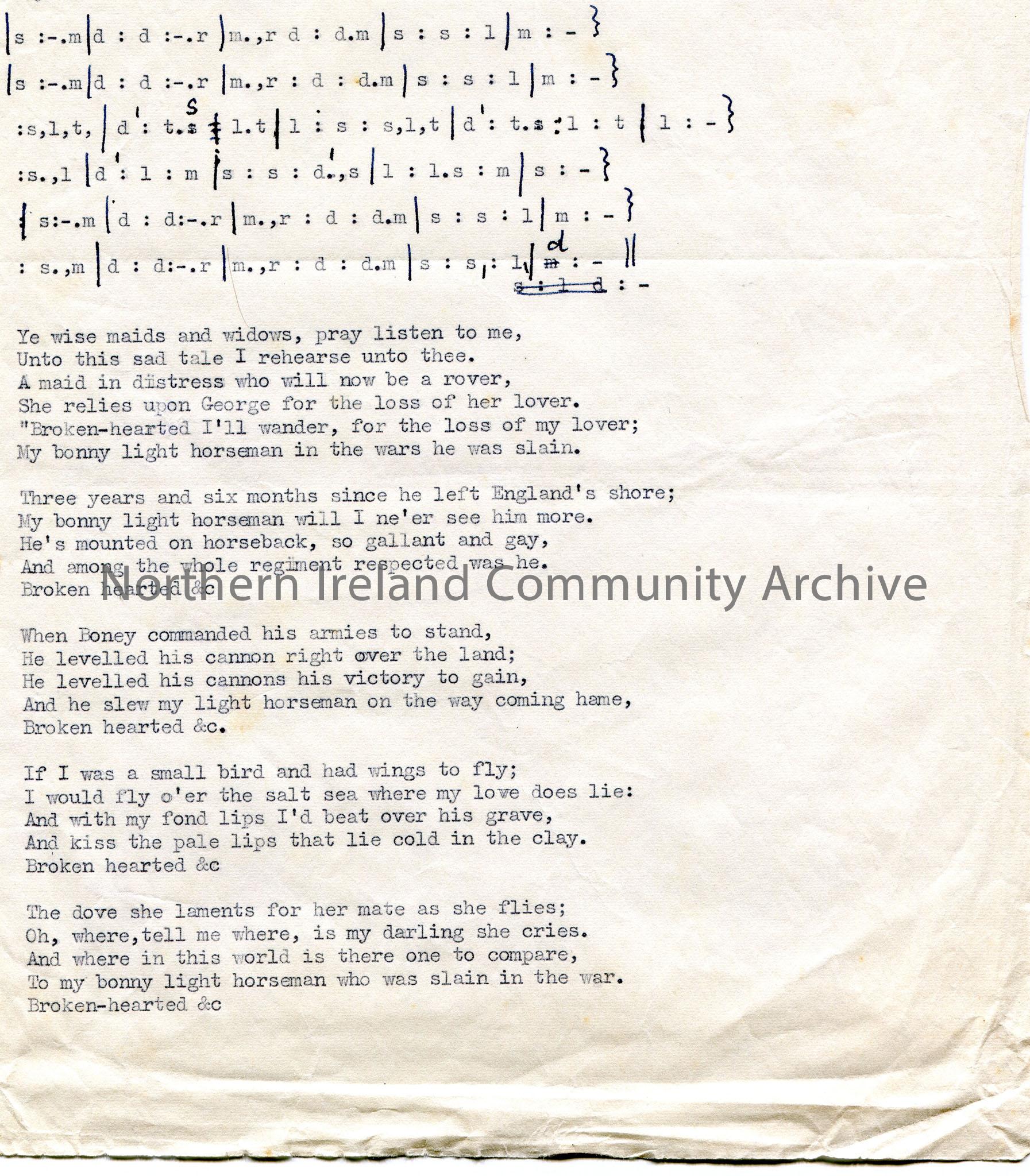 Typed tonic sol-fa notations and accompanying 5 verse song of ‘No 122 The Bonny Light Horseman. A Song of the Napoleonic Wars’. An X has been put thro… – scan042b