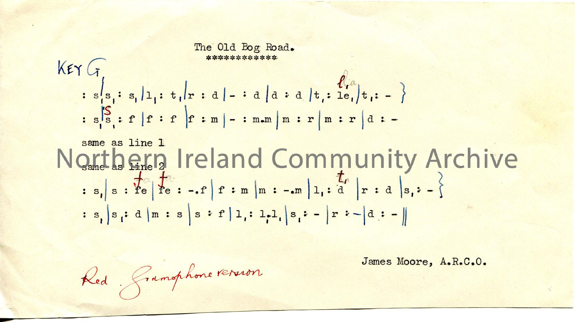 Typed tonic sol-fa on strip of paper to 'The Old Bog Road'. Donor ? James Moore, A.R.C.O. 'Red gramophone version' handwritten in red.