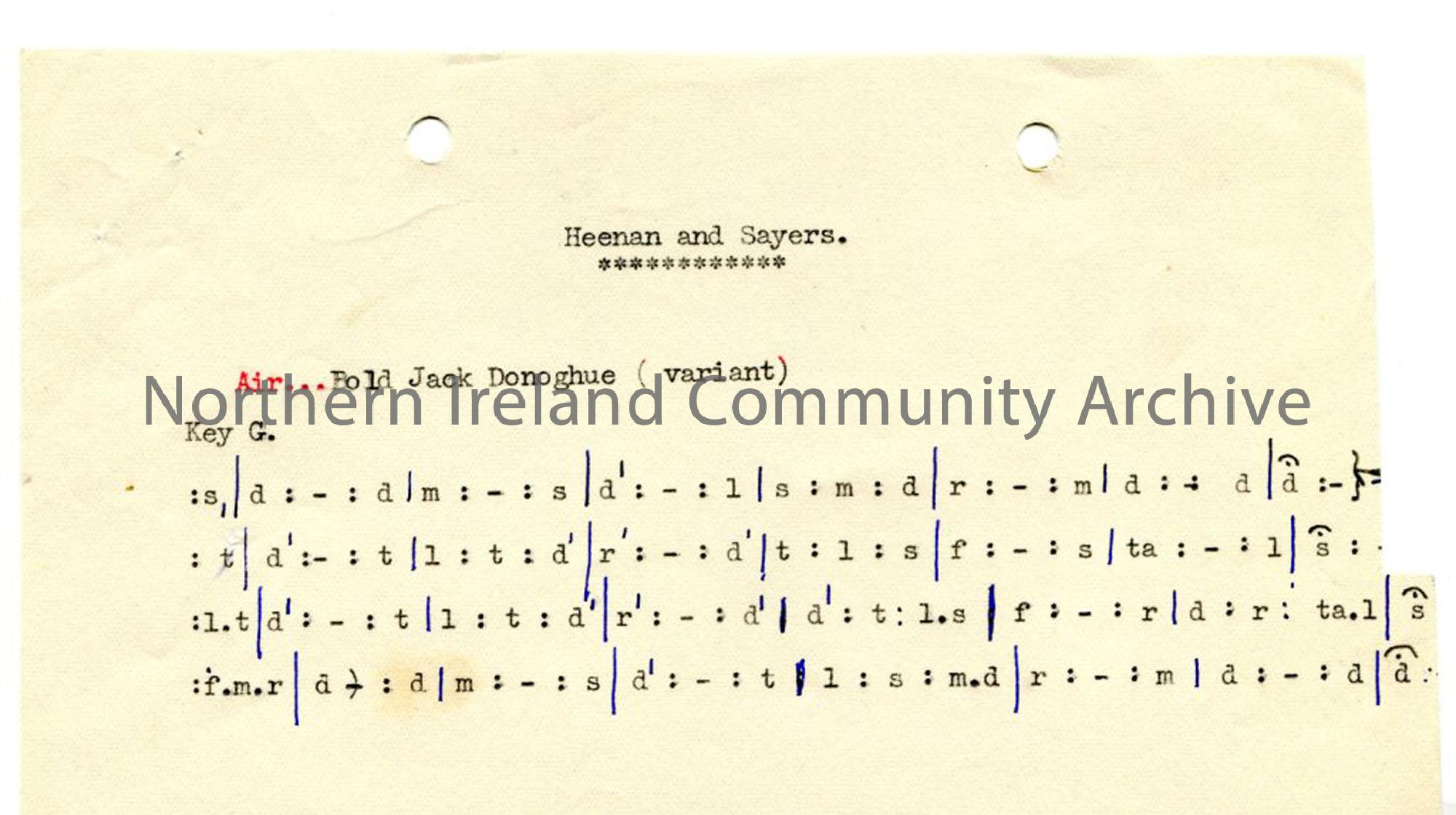 Typed tonic sol-fa to ‘Heenan and Sayers’. Also refers to air as ‘Bold Jack Donohue’.