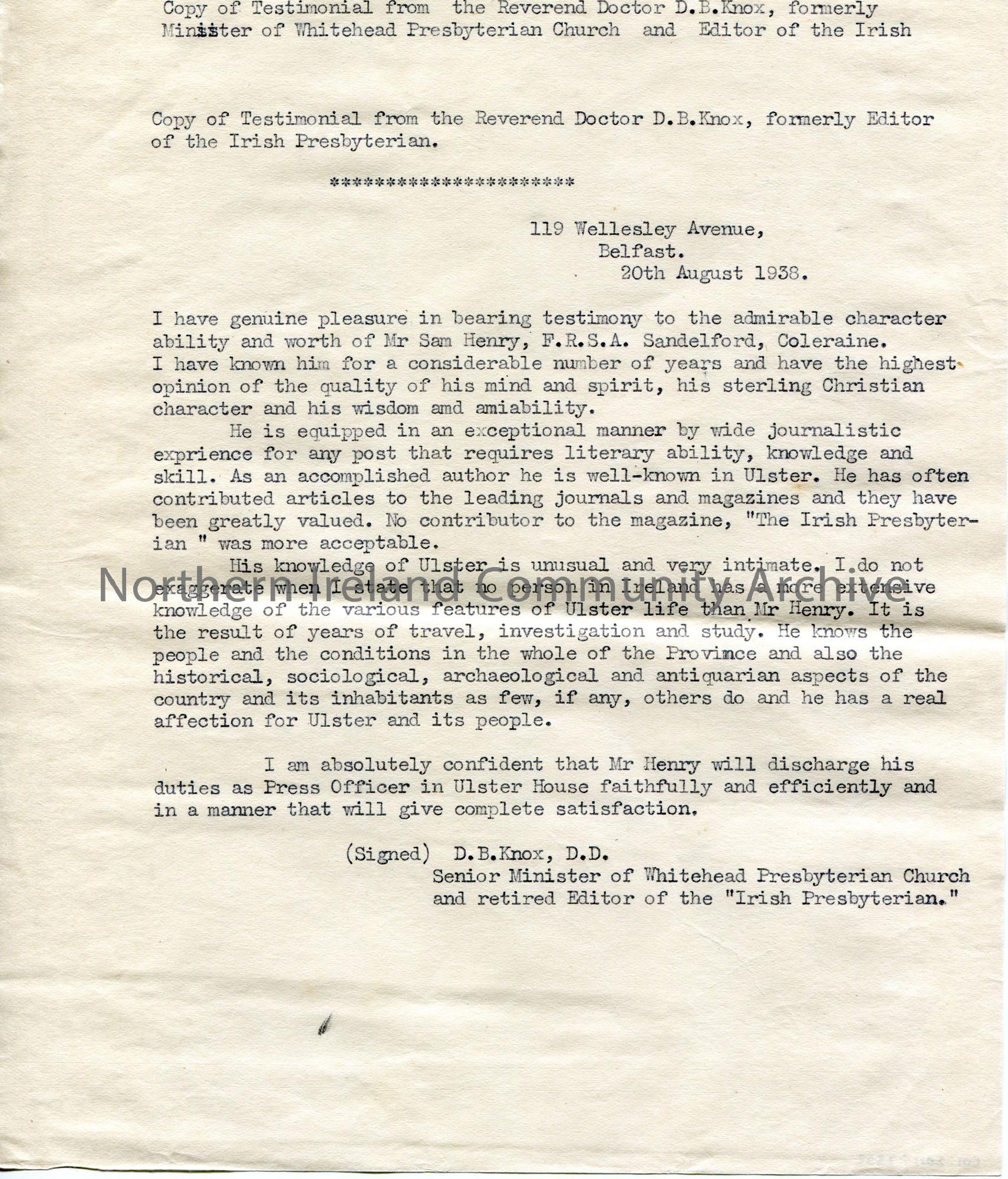 Typed transcription by Sam Henry of a handwritten testimonial for Sam re his application for post of Temporary Press Officer at the New Ulster House. Speaks highly of his character and official duties.
