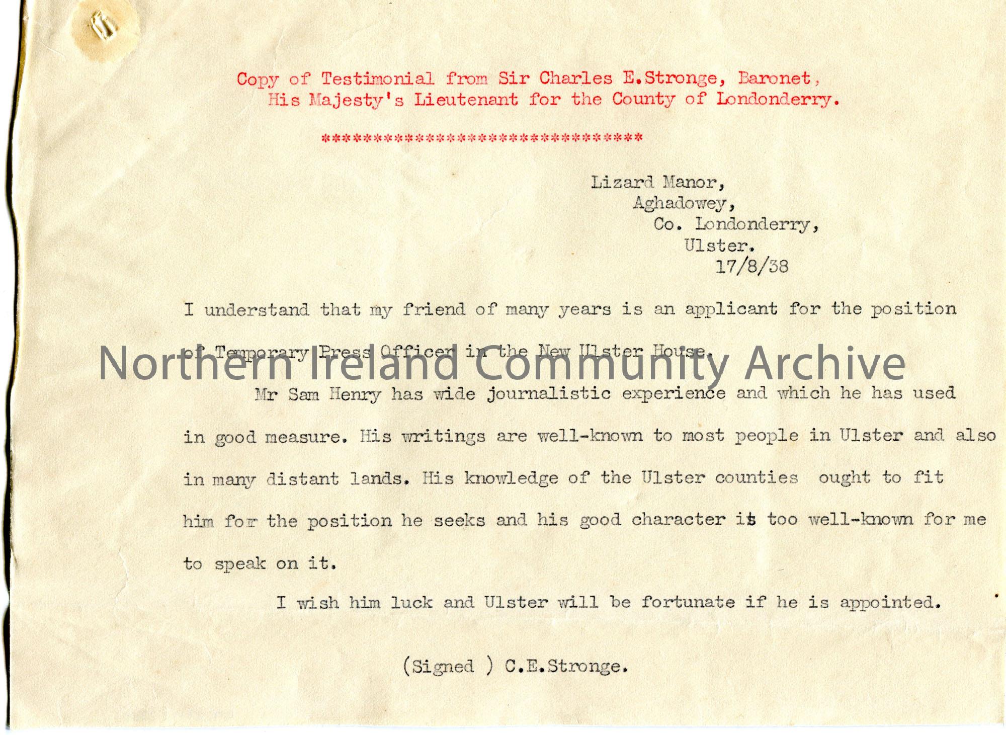 Typed transcription by Sam Henry of a testimonial from Sir Charles E.Stronge.Details typed in red at top of page. No recipient details given. States his reasons for Sam Henry to be appointed as Temporary Press Officer in the New Ulster House.