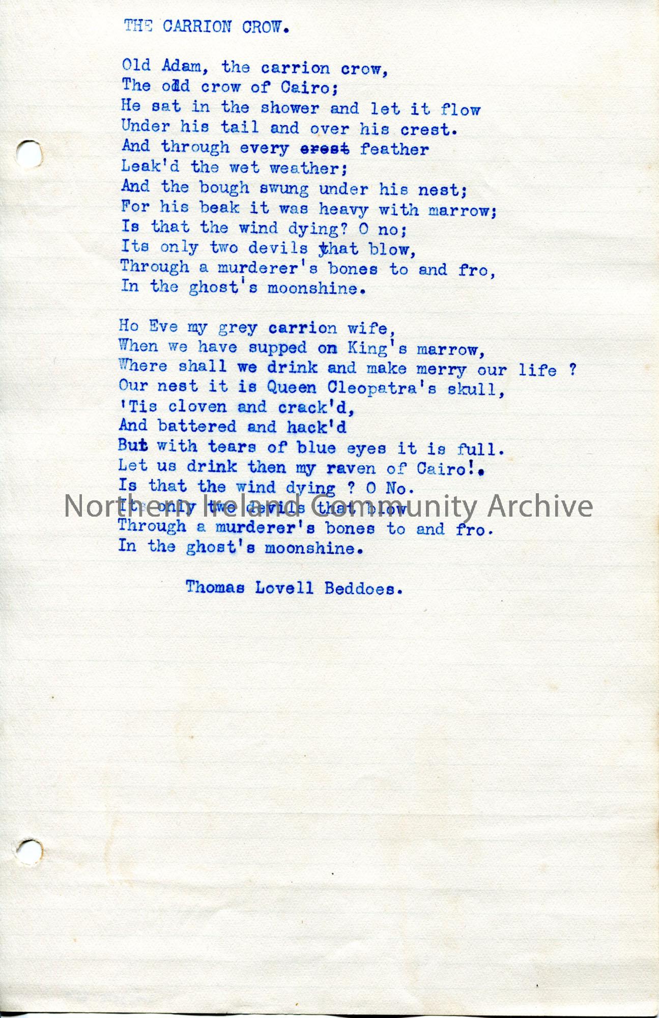 Typed two verse poem titled, 'The Carrion Crow'. By Thomas Lovell Beddoes.