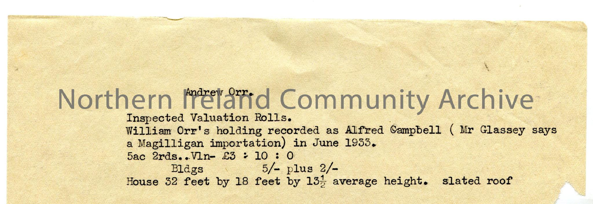 Typed valuation notes – valuation records, Orr holdings.