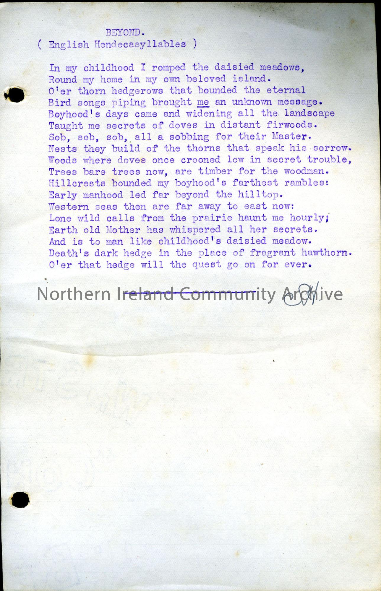Typed verse by Sam Henry titled ‘Beyond (English Hendecasyllables)’. Handwritten initials of ‘SH’ at end of verse.